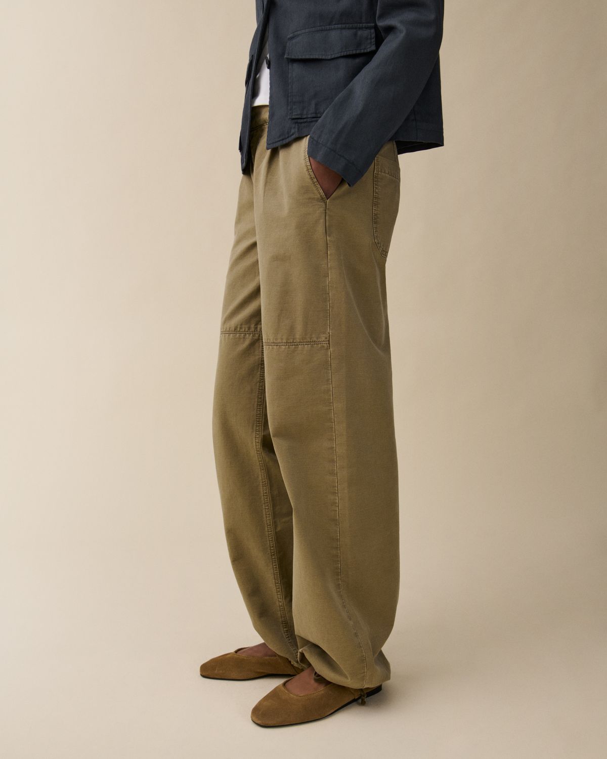 ʼMina' is a chino-inspired utility trouser featuring a low-rise silhouette with a loose fit.