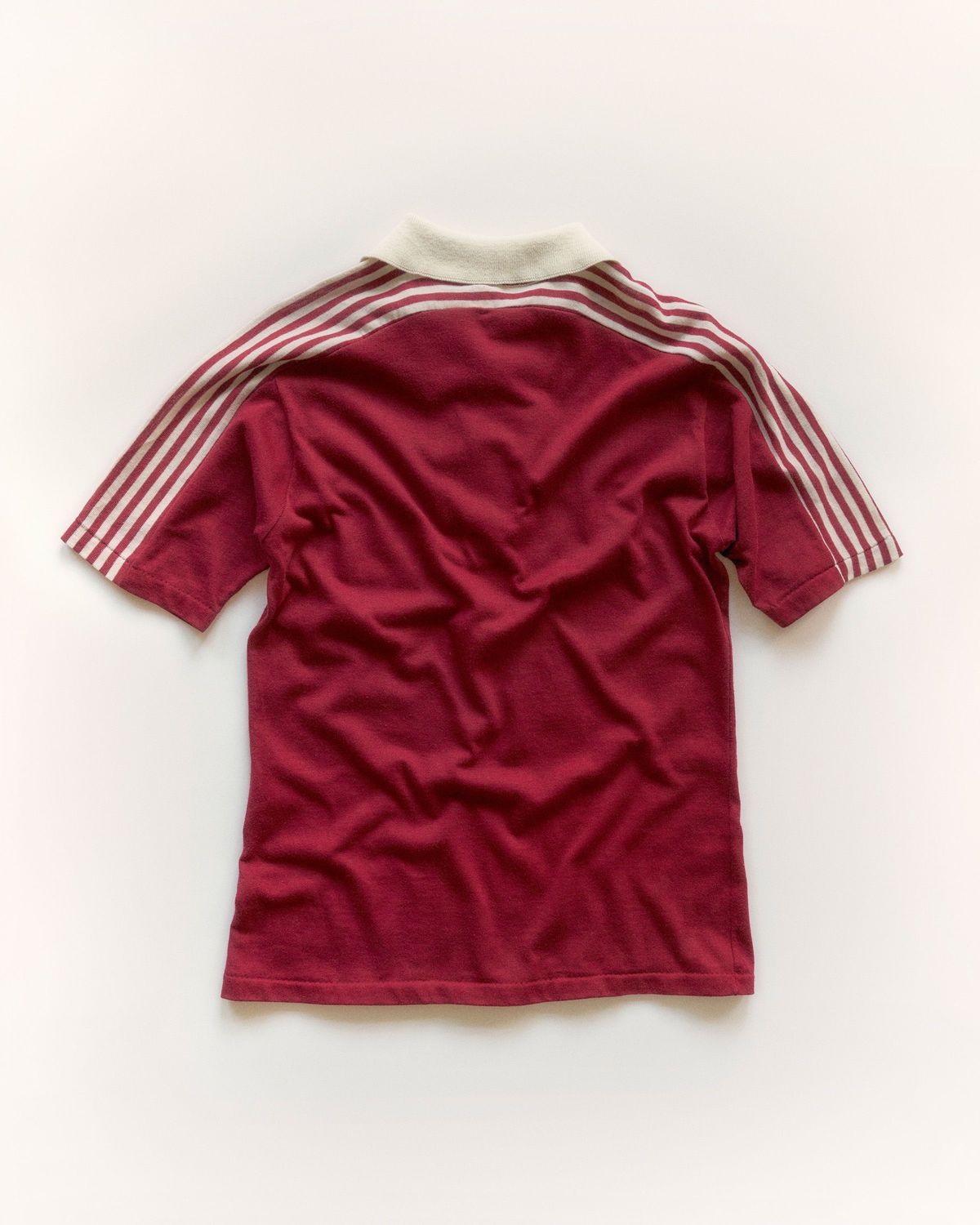 Burgundy polo in burgundy, accented gently with off-white details.M 50% PES/ 50% CottonMade in USANote: 2 mended holes and an open hem.