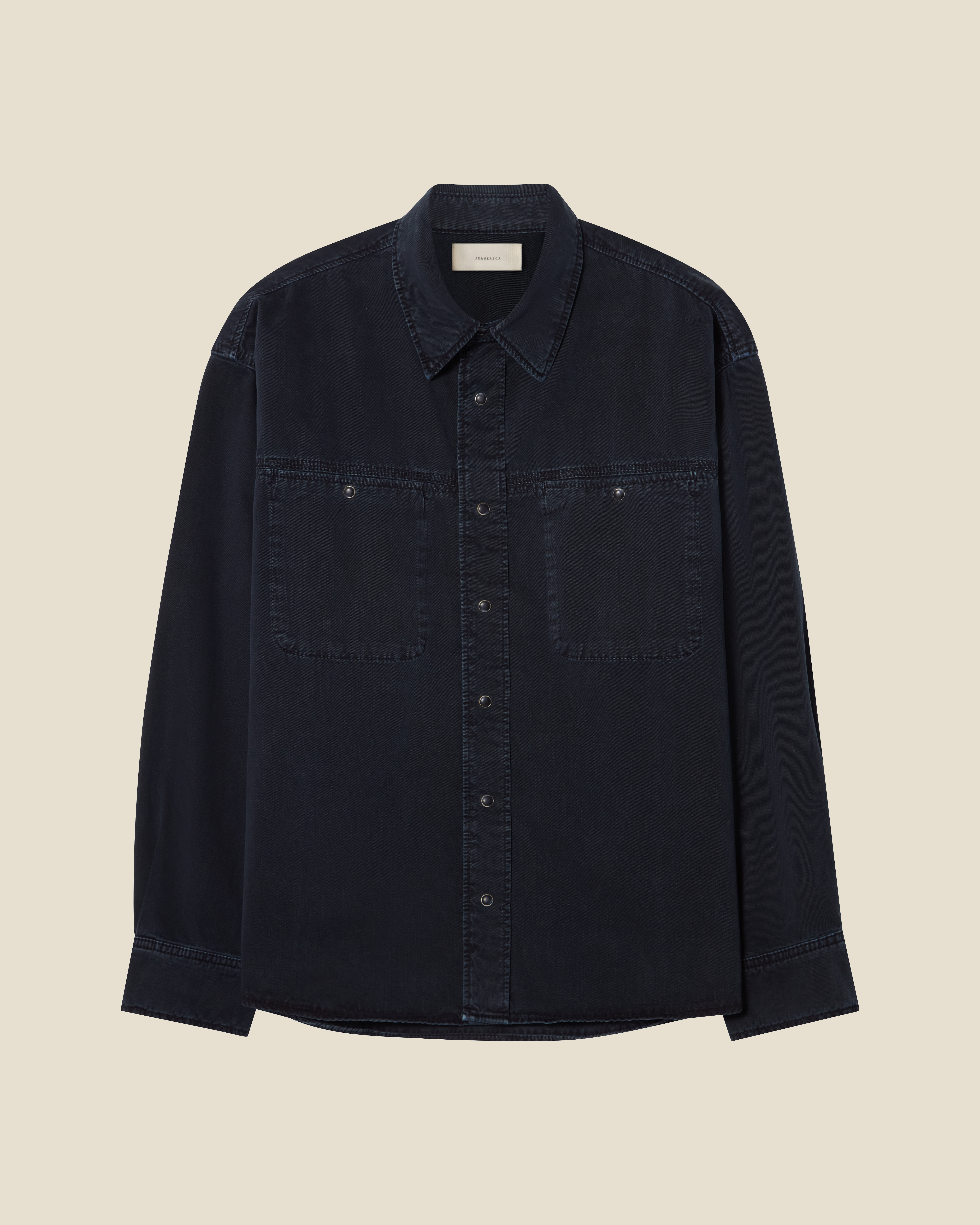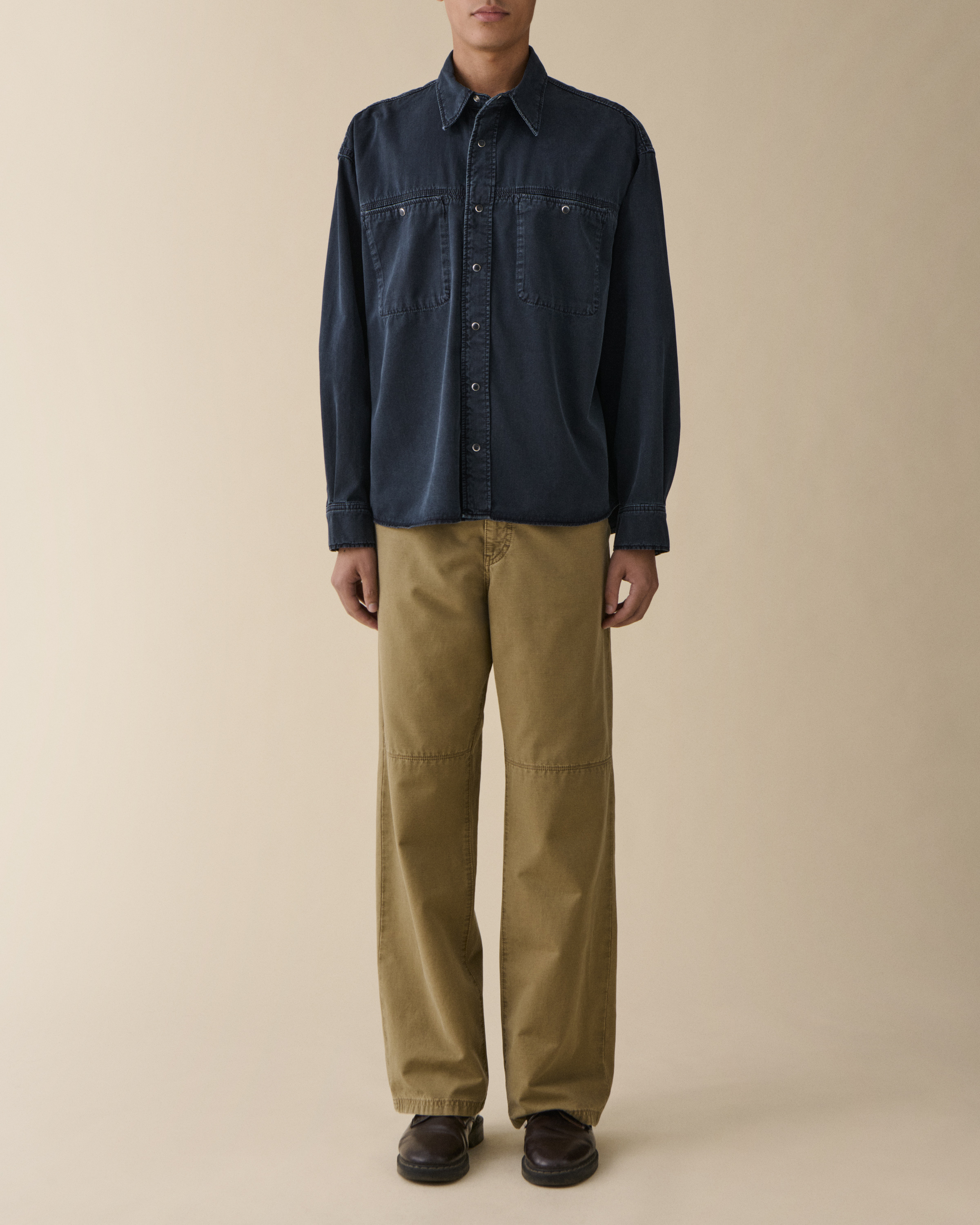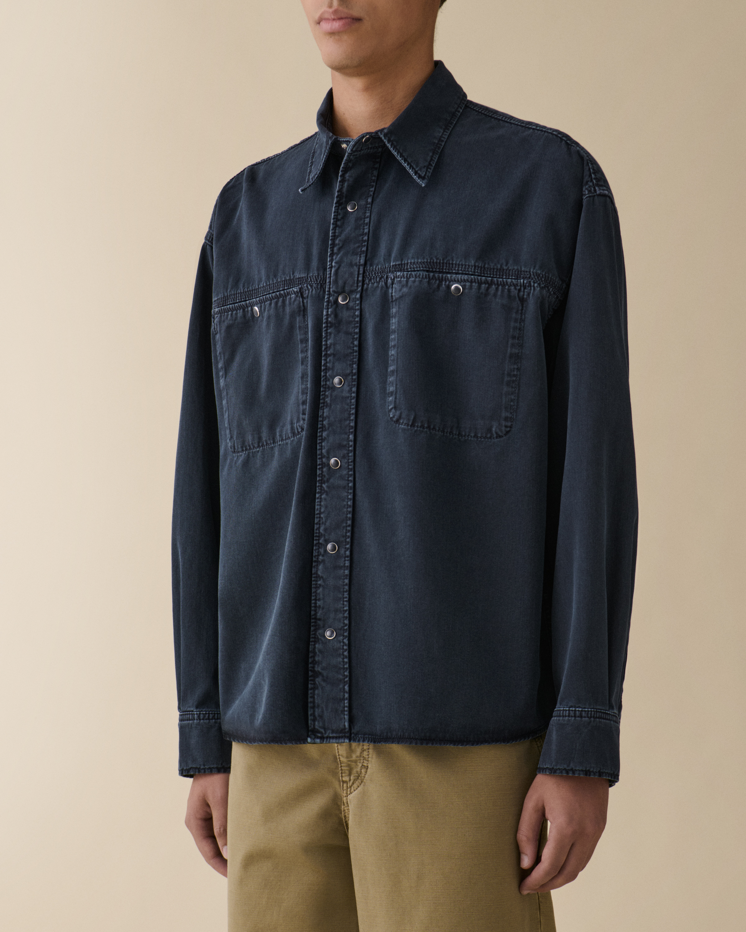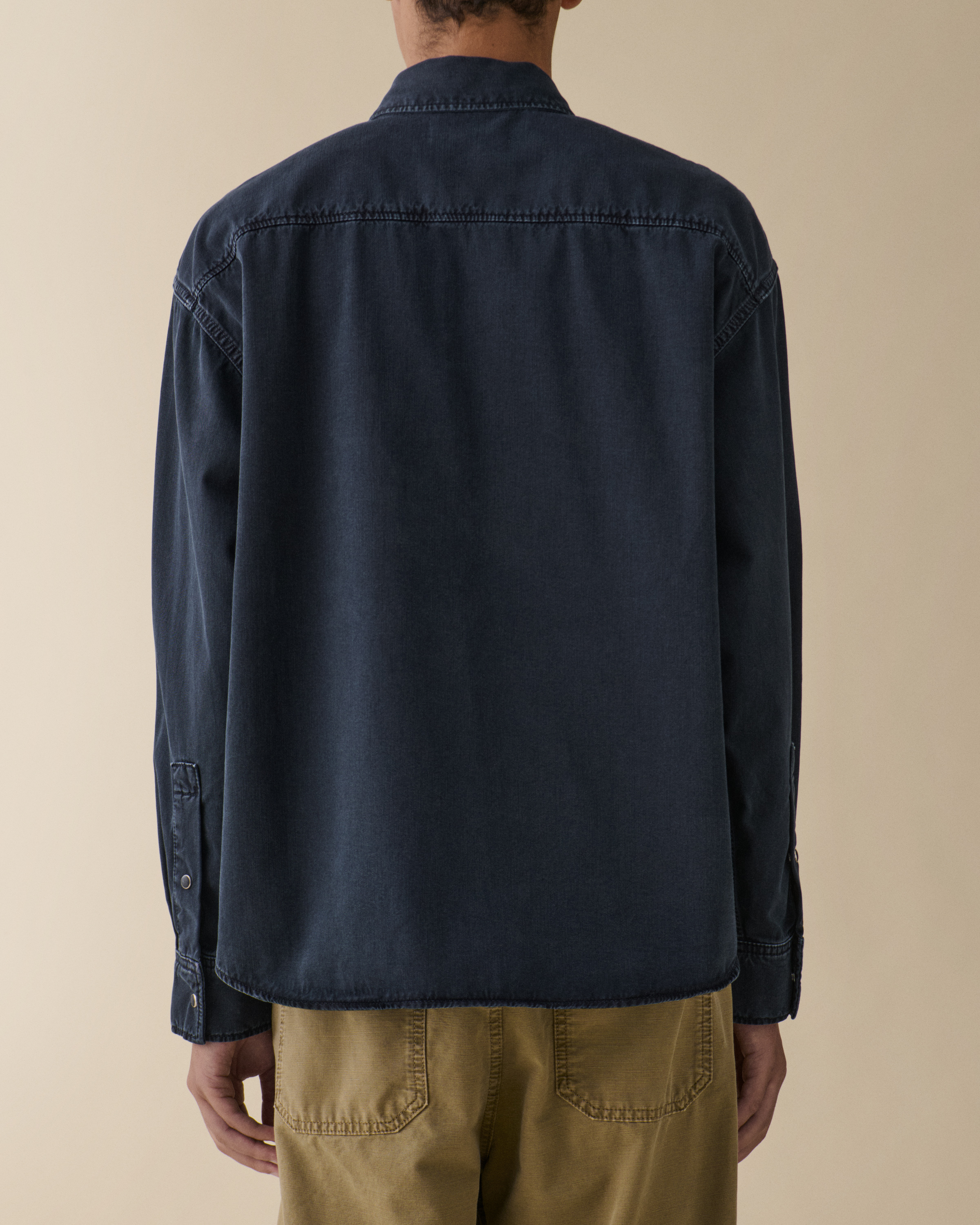 'André' is a contemporary worker-style shirt with a relaxed, boxy silhouette. Featuring a distinctive yoke with triple needle seam construction.Model is 188 cm/6'2" and wears size Medium.True to size.