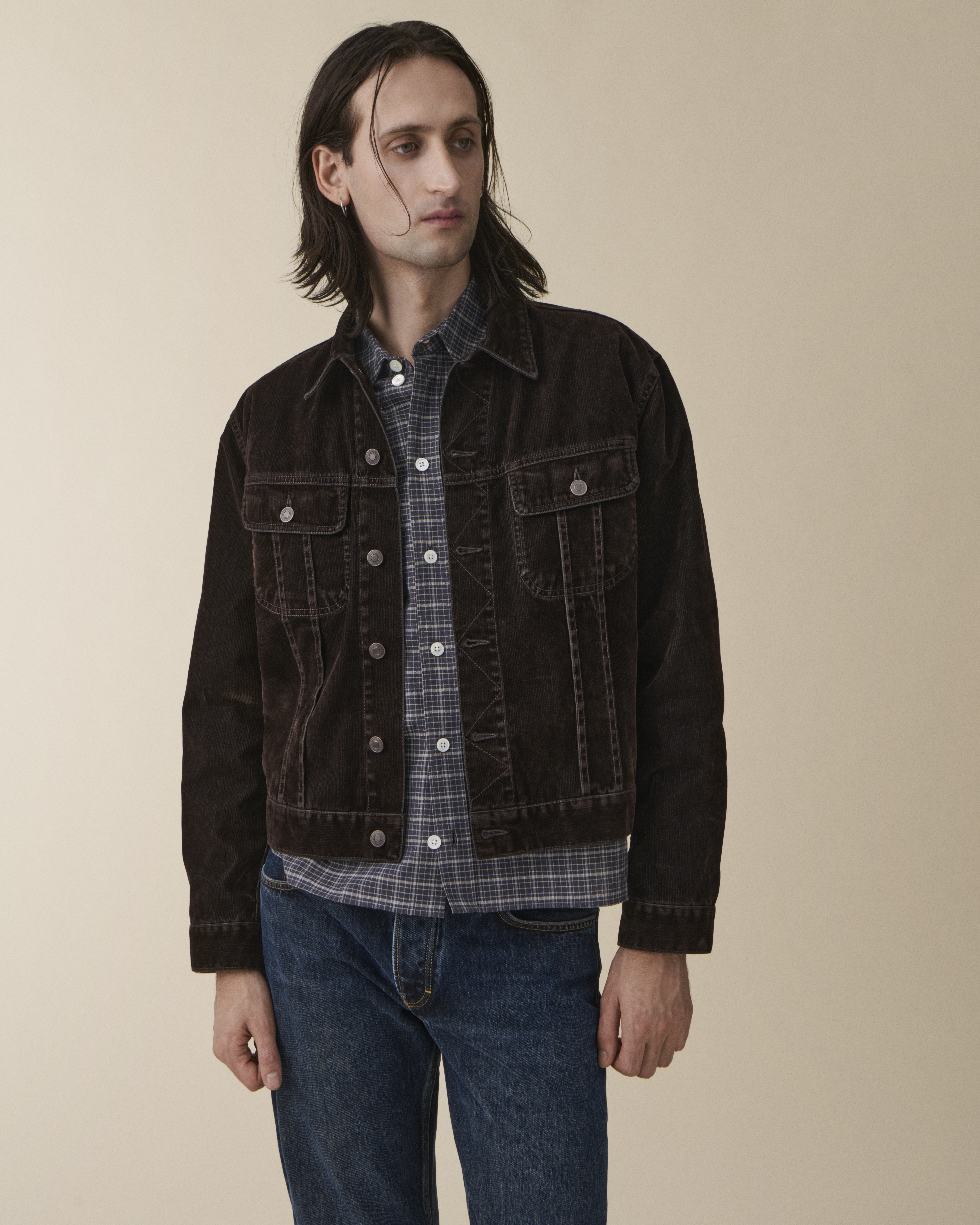 'Alex' is a fitted denim jacket crafted from an innovative fabric — a denim base layered with a viscose flock, creating the look and texture of corduroy. This unique combination offers the sturdiness of denim, allowing the jacket to be washed down, resulting in a one-of-a-kind, worn-in look over time. Featuring a shorter cut and metal buttons.Model is 188 cm/6'2” and wears size Medium.