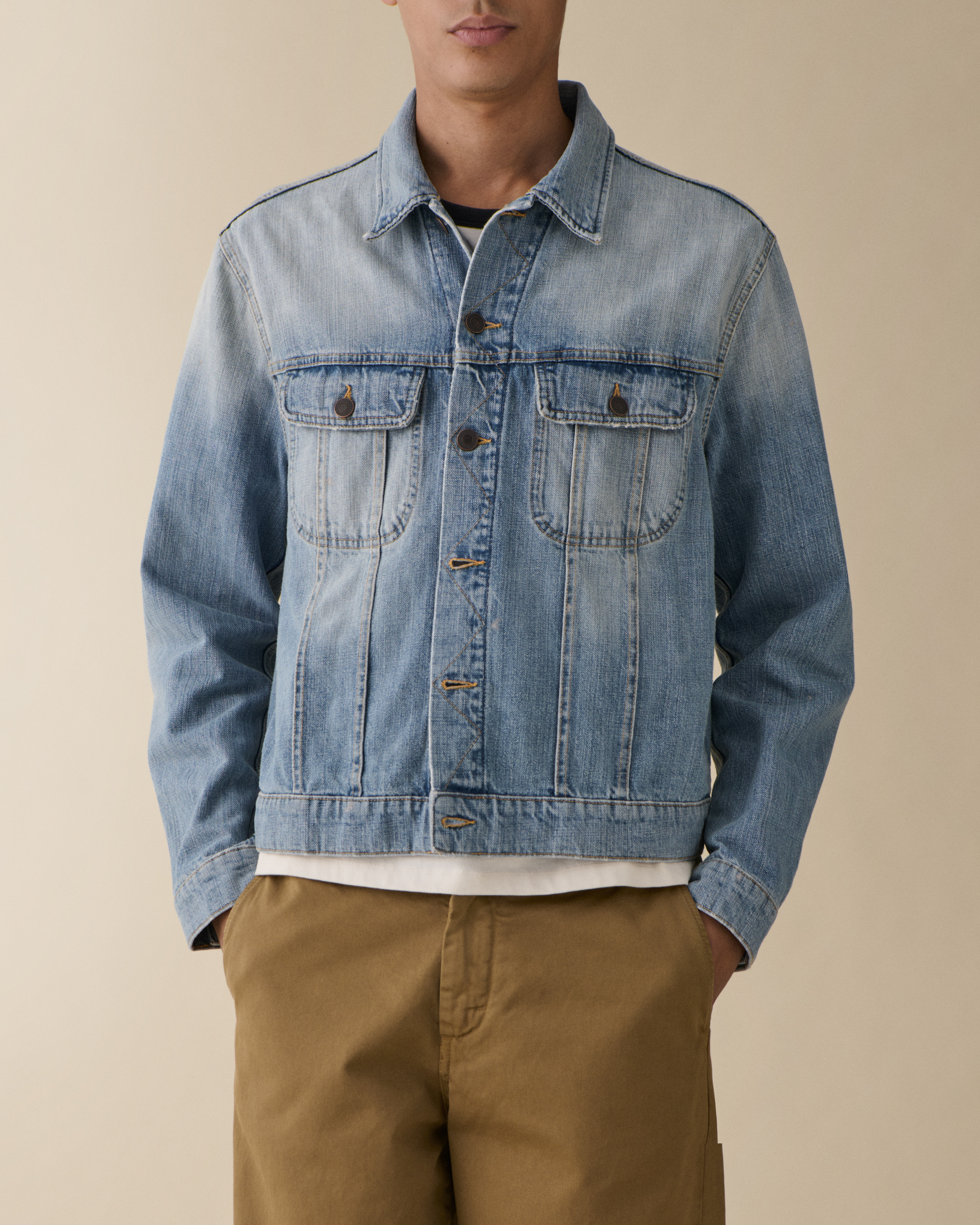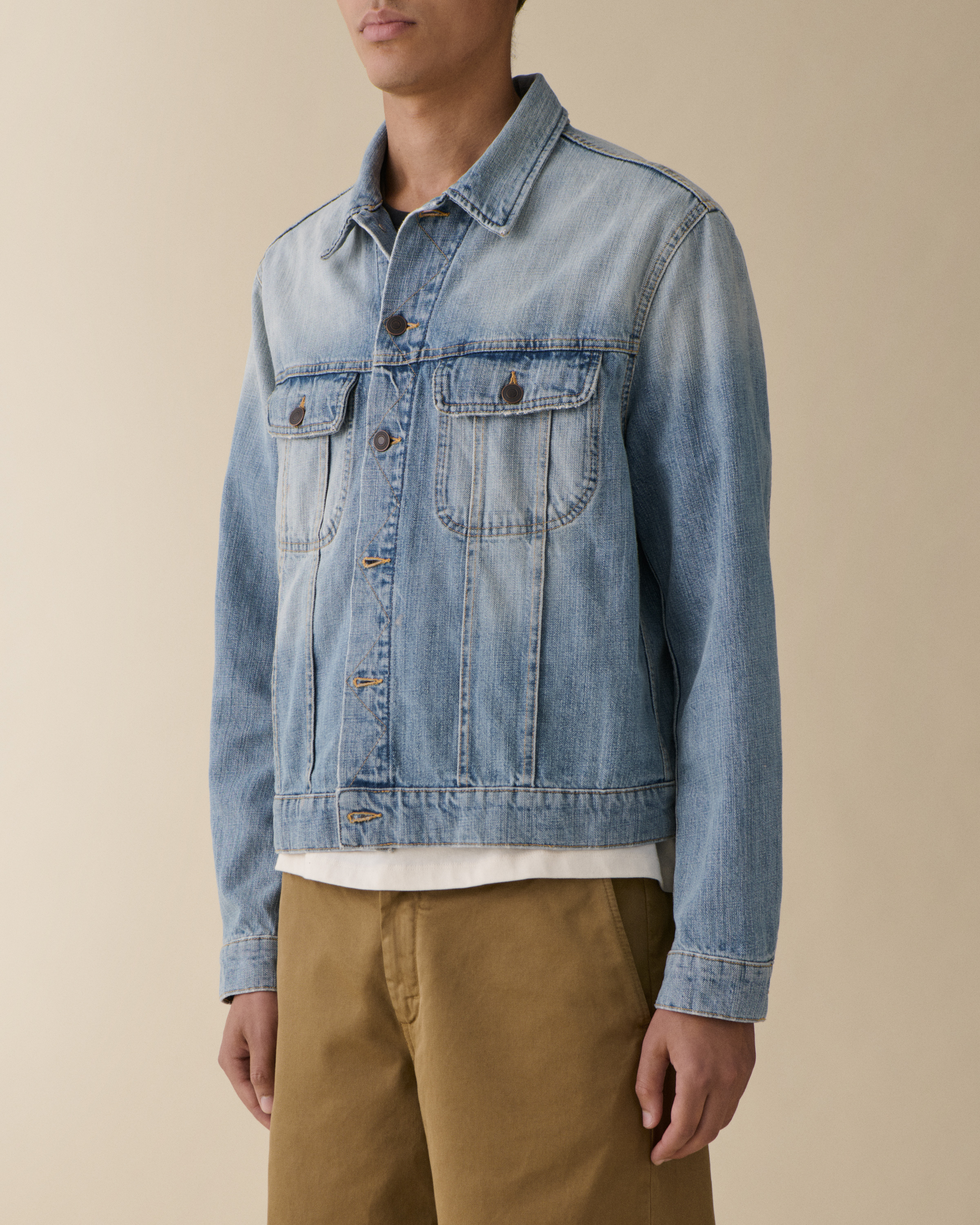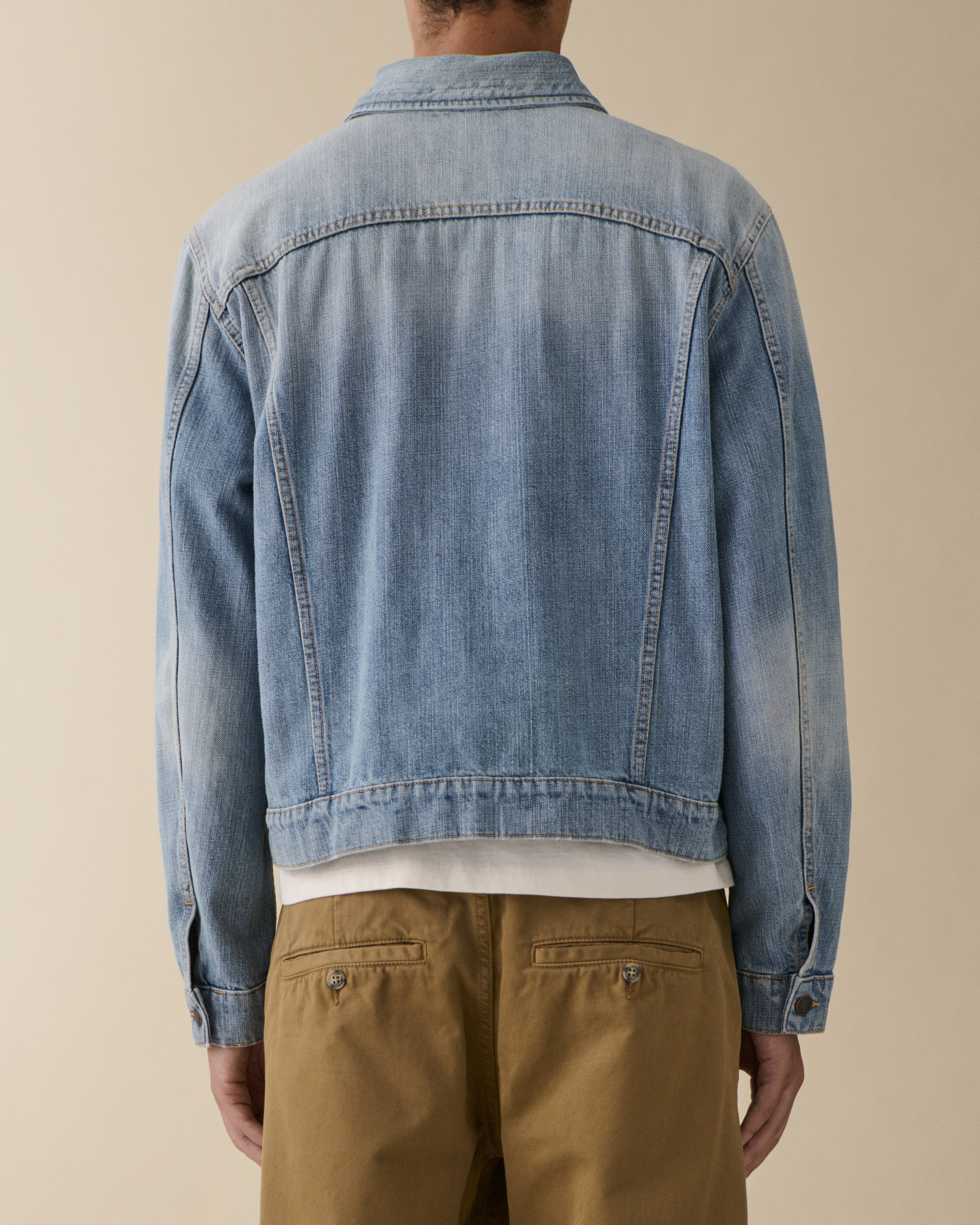 'Alex' is a fitted denim jacket featuring a contemporary shorter cut that creates a modern silhouette. Distinguished by its metal buttons and two rounded chest pockets, this versatile piece embodies Jeanerica's minimalist aesthetic while providing timeless denim style.Crafted in Light Blue Righe, a clean, bright wash with subtle vertical striping, this jacket is made from a premium cotton-rich blend (64% Cotton, 14% Polyester, 22% Viscose) that ensures both structure and comfort. The refined proportions make it perfect for layering throughout the seasons.