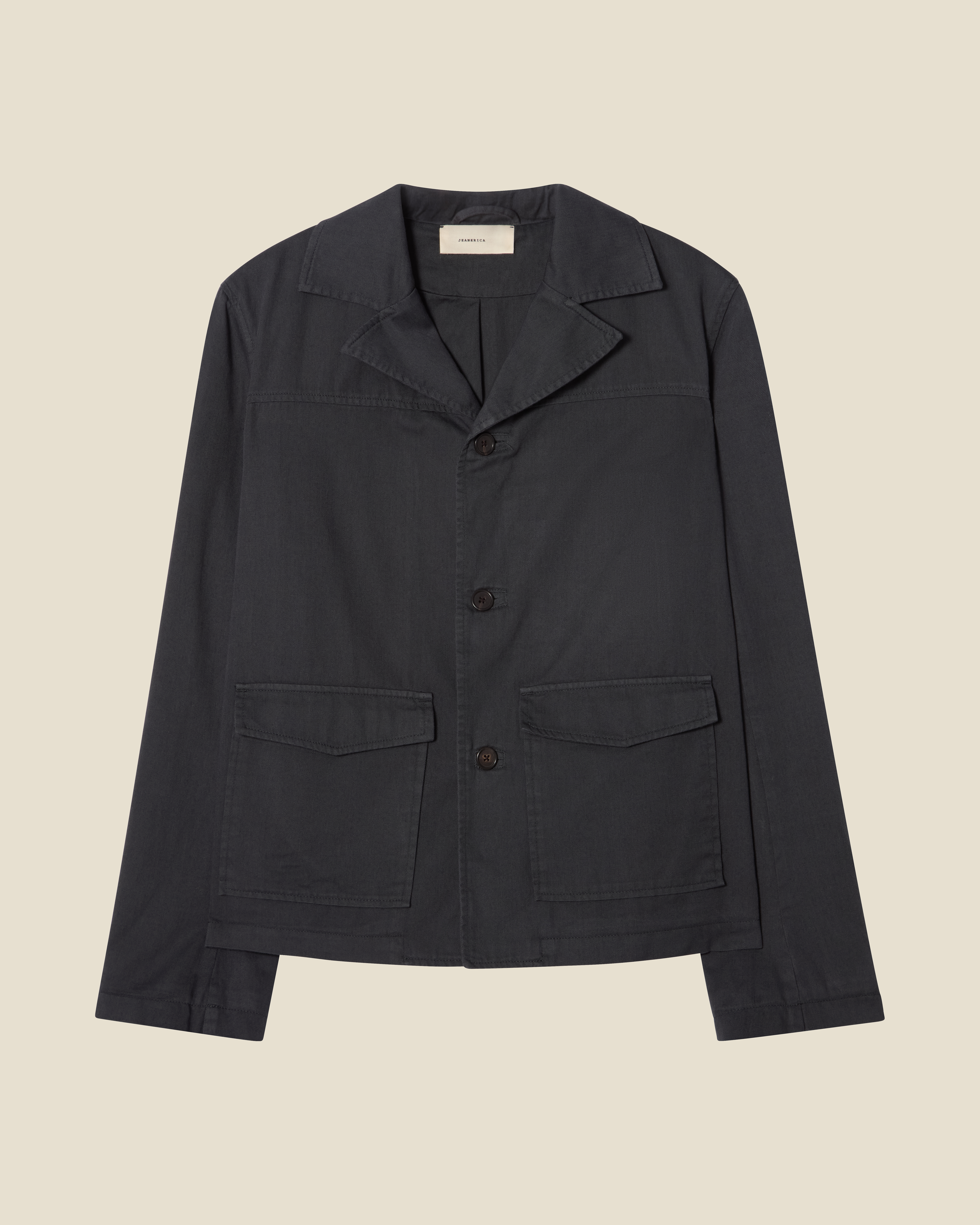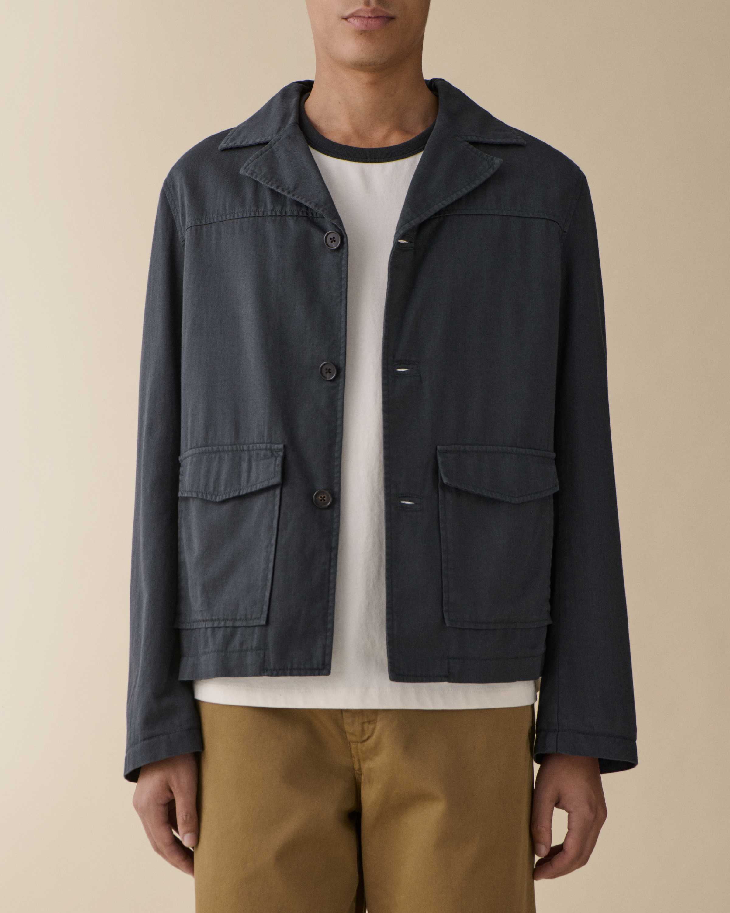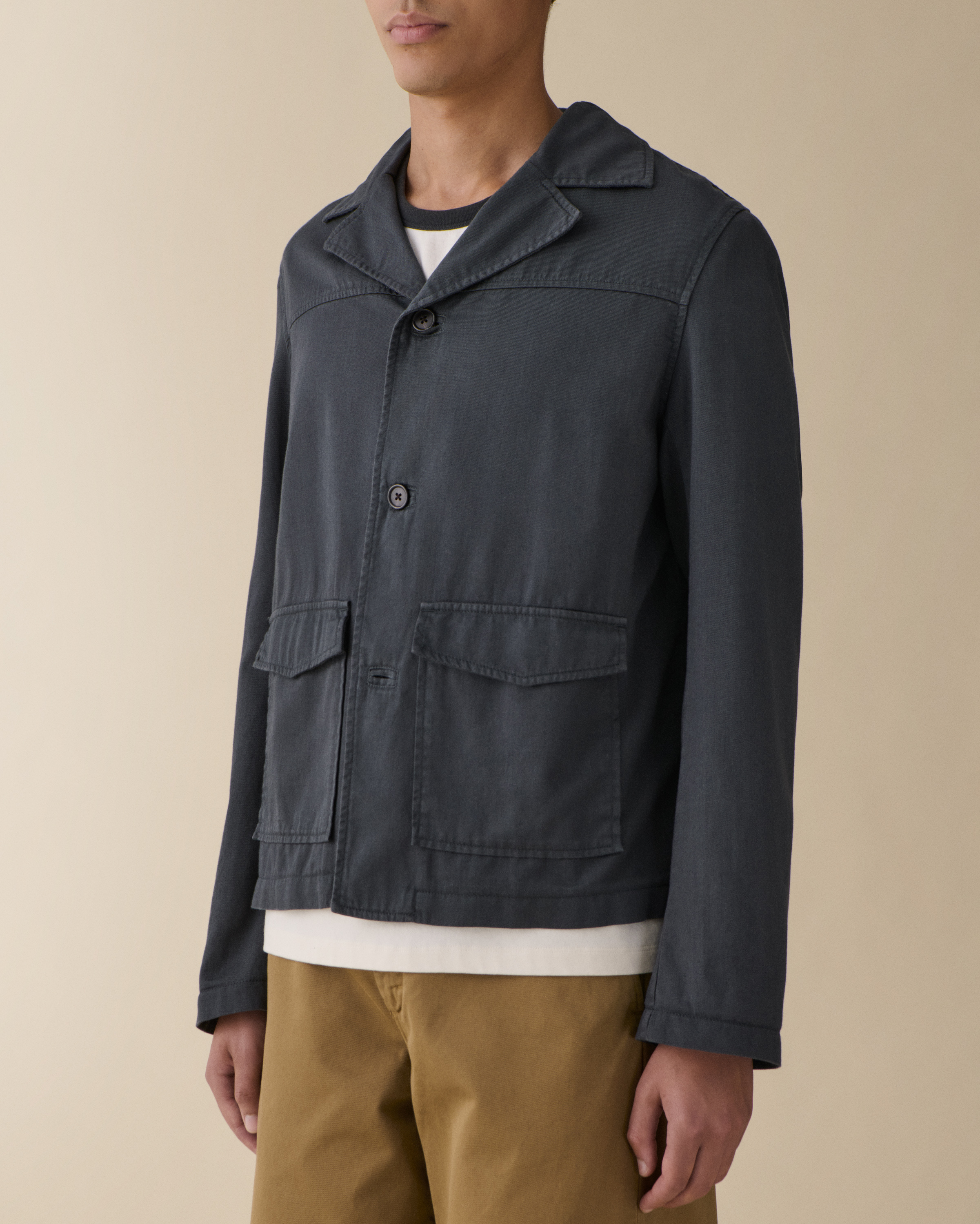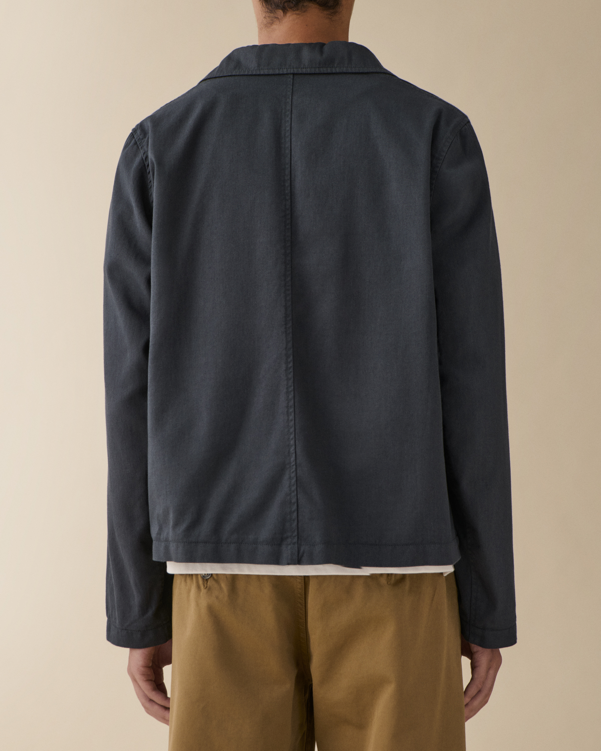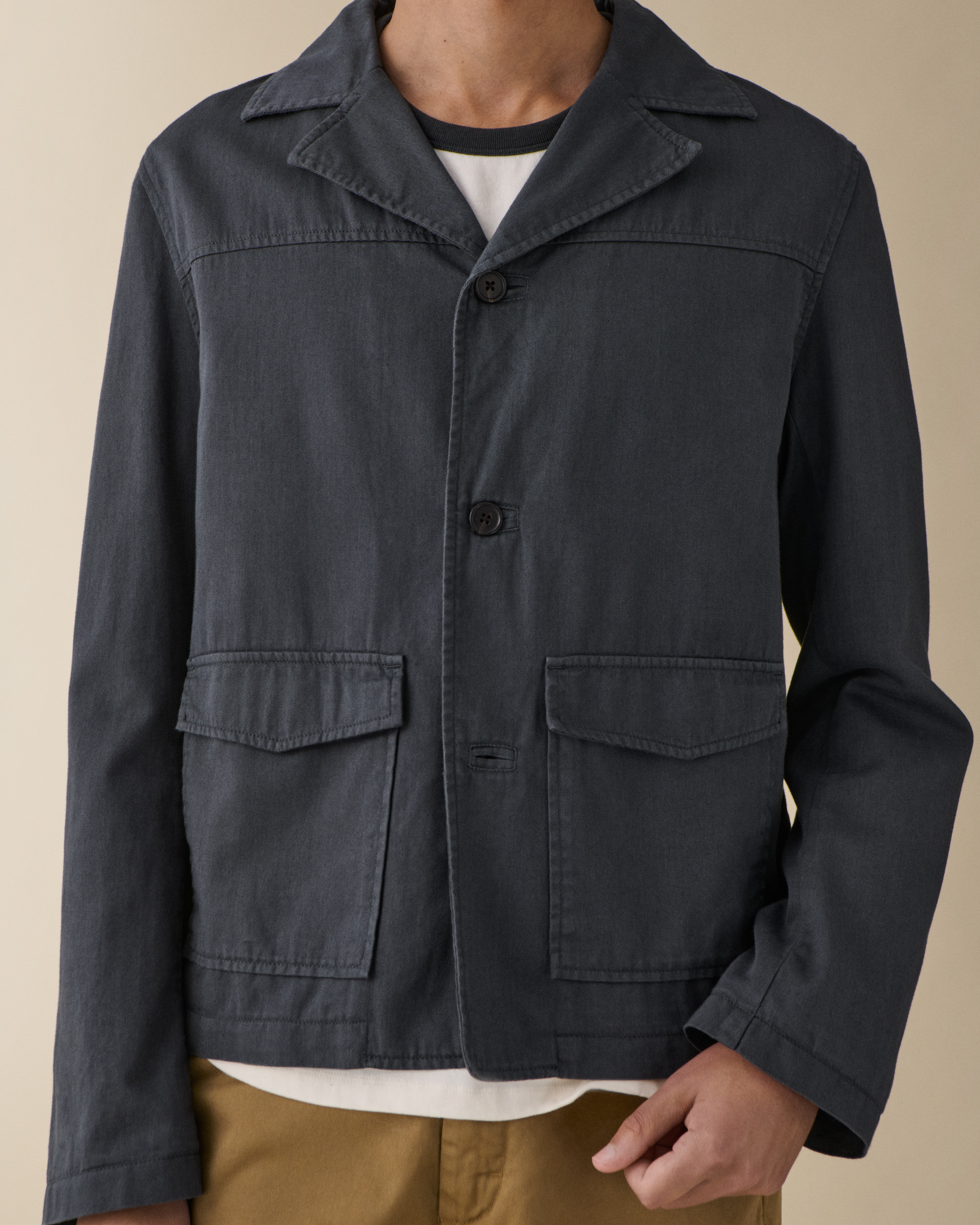 'Chet' is an tailored jacket with a boxy silhouette. Featuring front patch pockets, horn buttons, and distinctive collar and yoke details.Model is 188 cm/6'2” and wears size Medium.