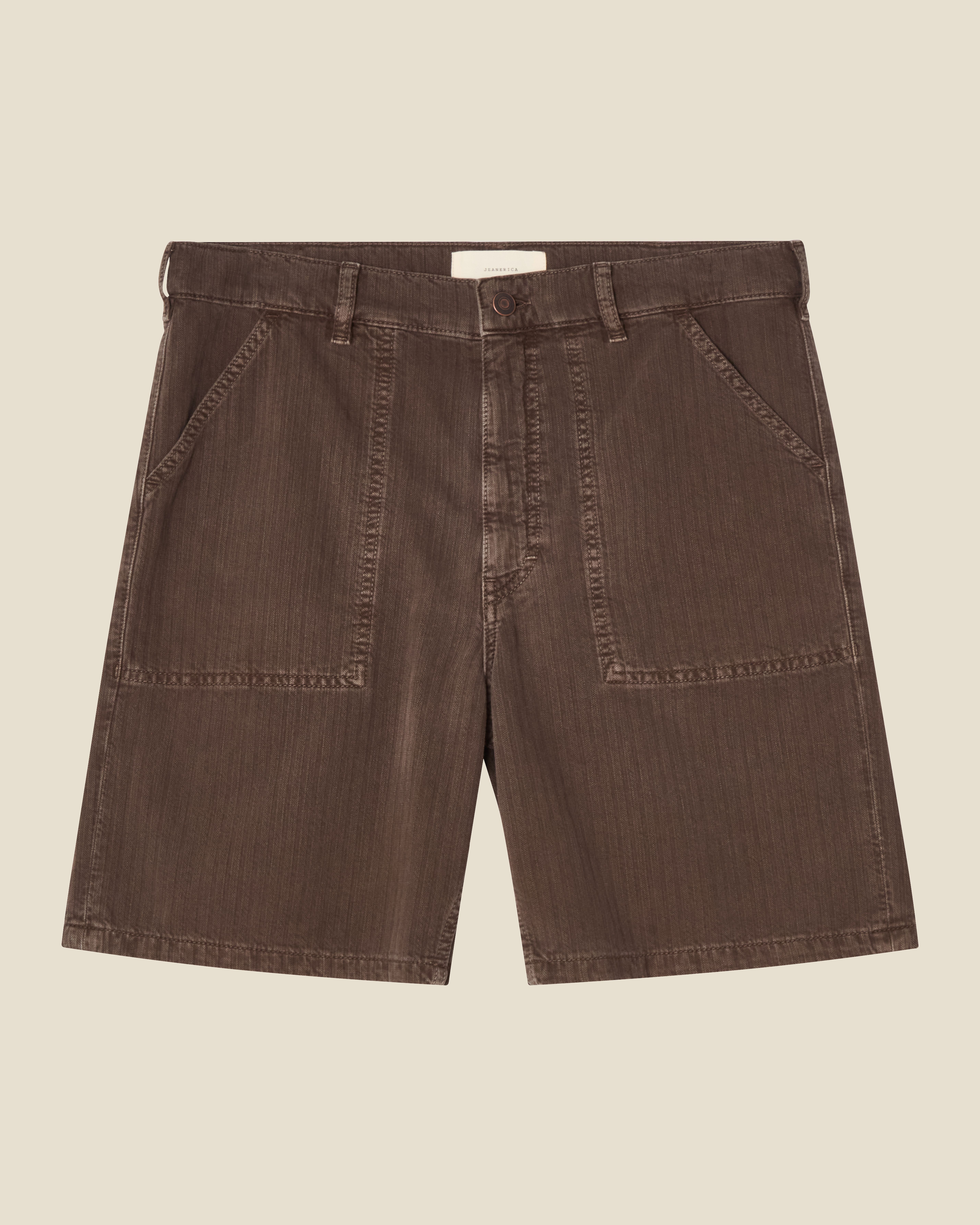 'Genua Worker Chino Shorts' are the perfect summer shorts with a mid-rise waist and straight leg silhouette. Featuring functional patch pockets inspired by classic worker pants for a blend of utility and style. Crafted from a comfortable cotton-blend fabric (58% Cotton, 23% Polyester, 19% Viscose) in a versatile Chevron Brown color. The relaxed, loose fit provides easy movement while the non-stretch material maintains a structured shape. Finished with a clean zip fly closure for a polished look.