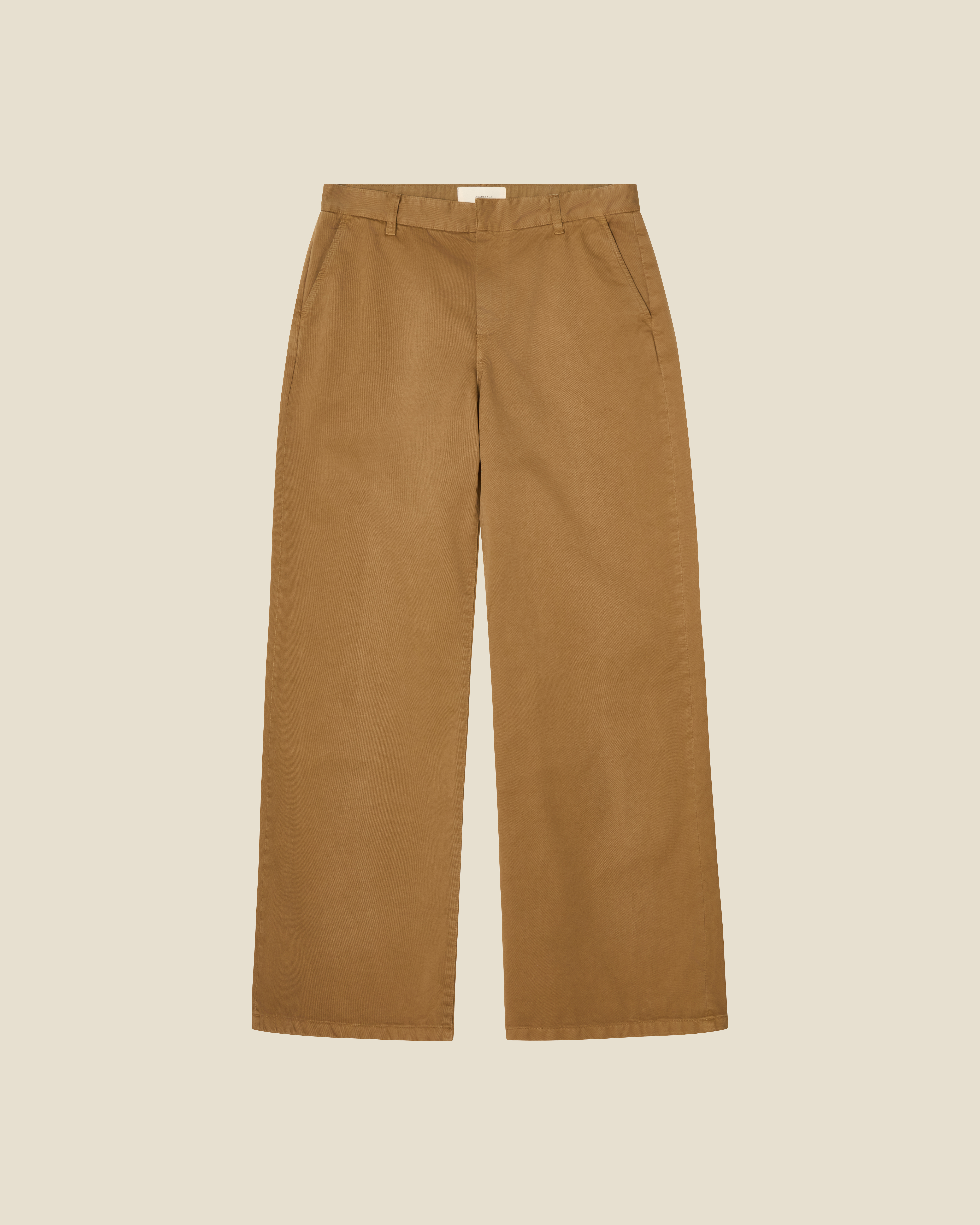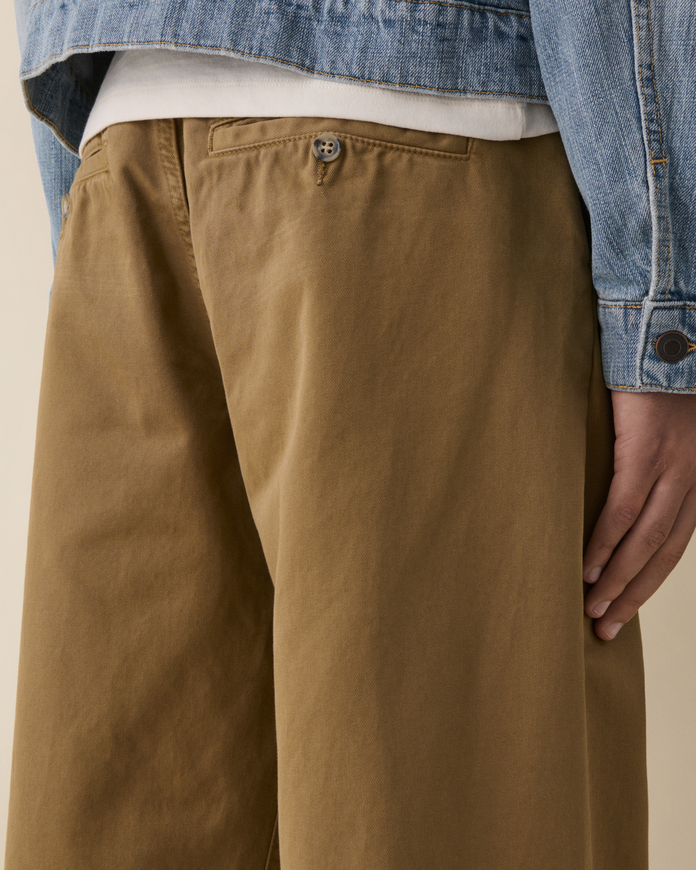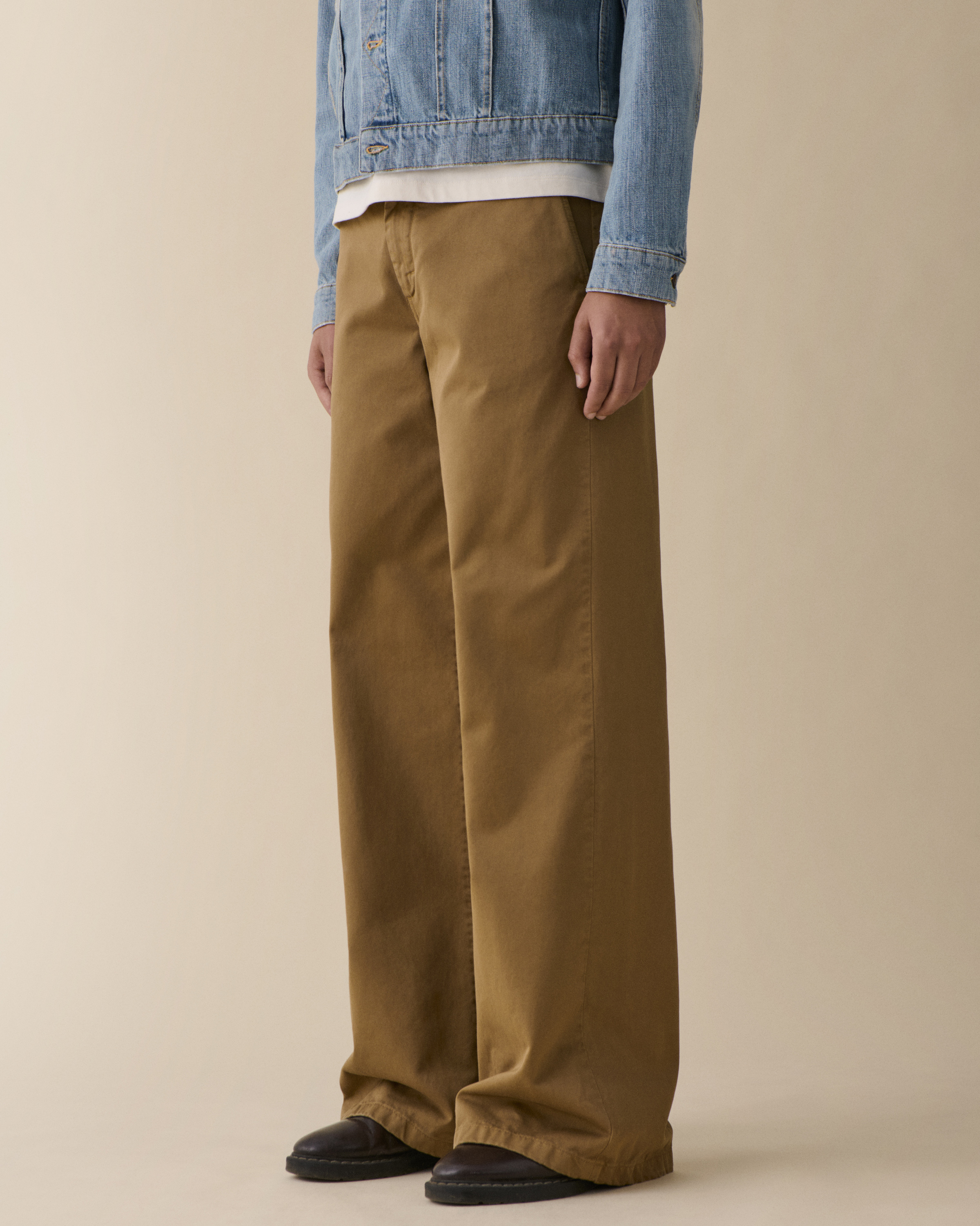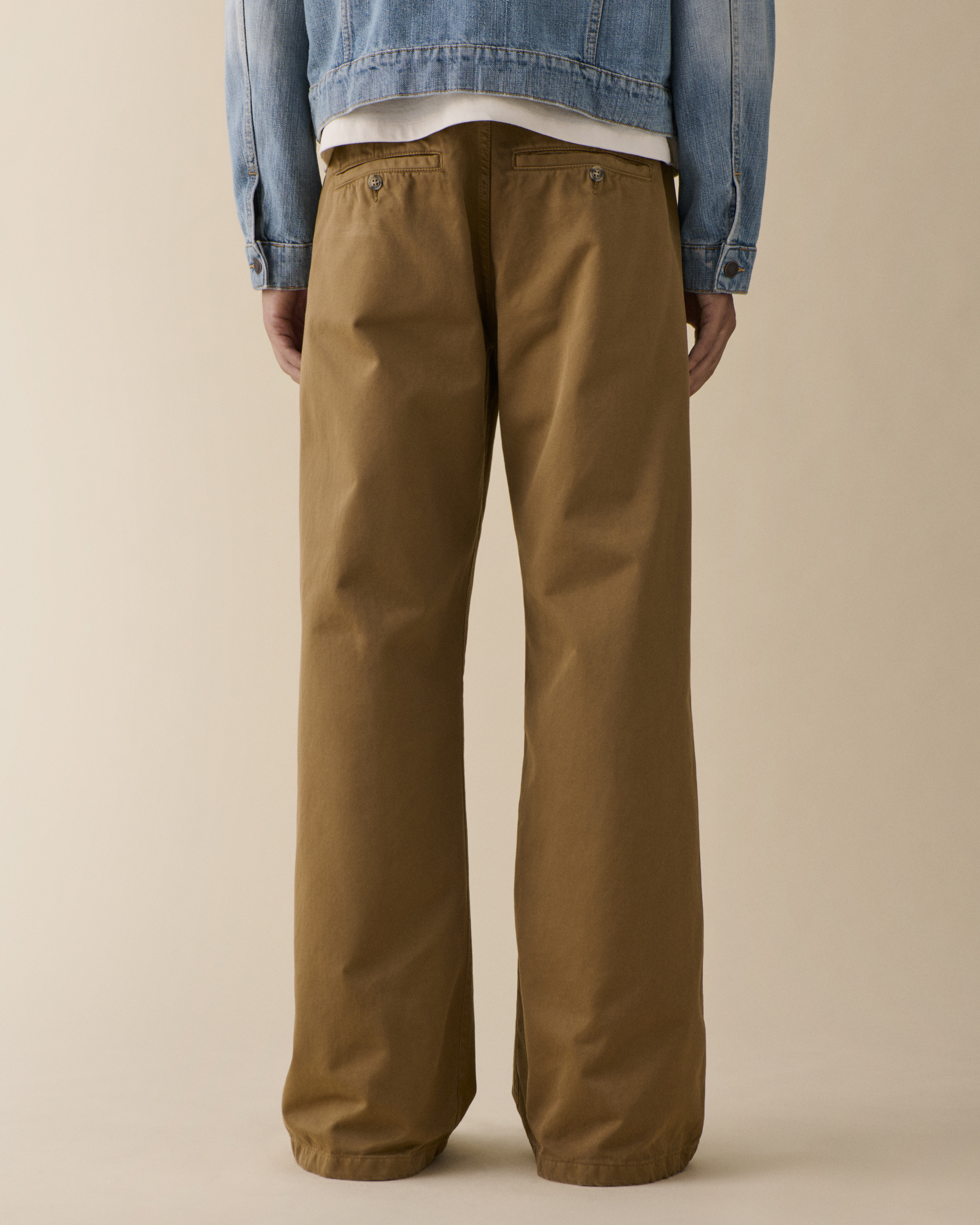 'Gion Chino' is a low-waist trouser with a relaxed, flared silhouette. Features a low rise fit that sits comfortably on the hip with a loose cut through the thigh.Model is 188 cm/6'2” and wears waist 31 and length 34.True to size.