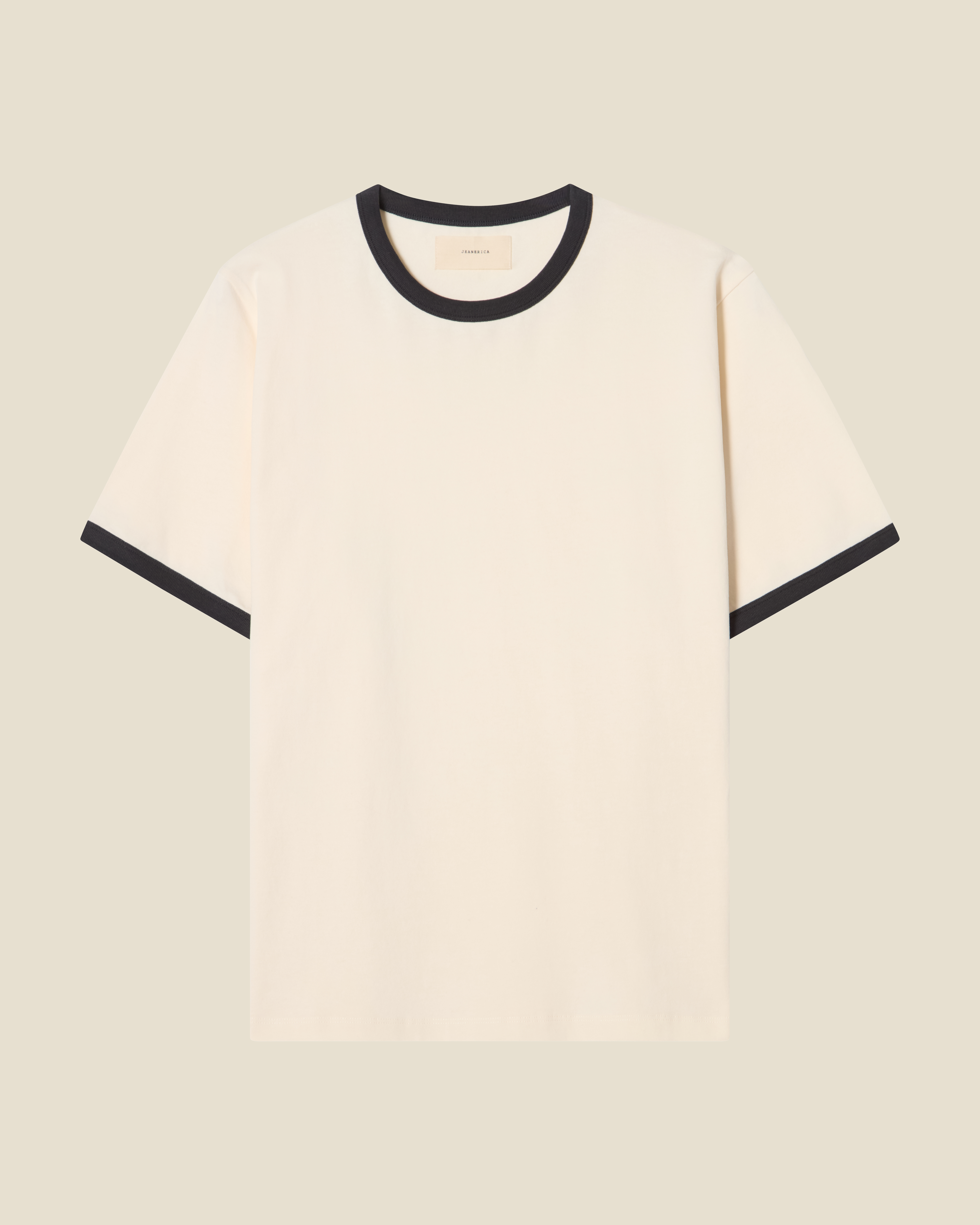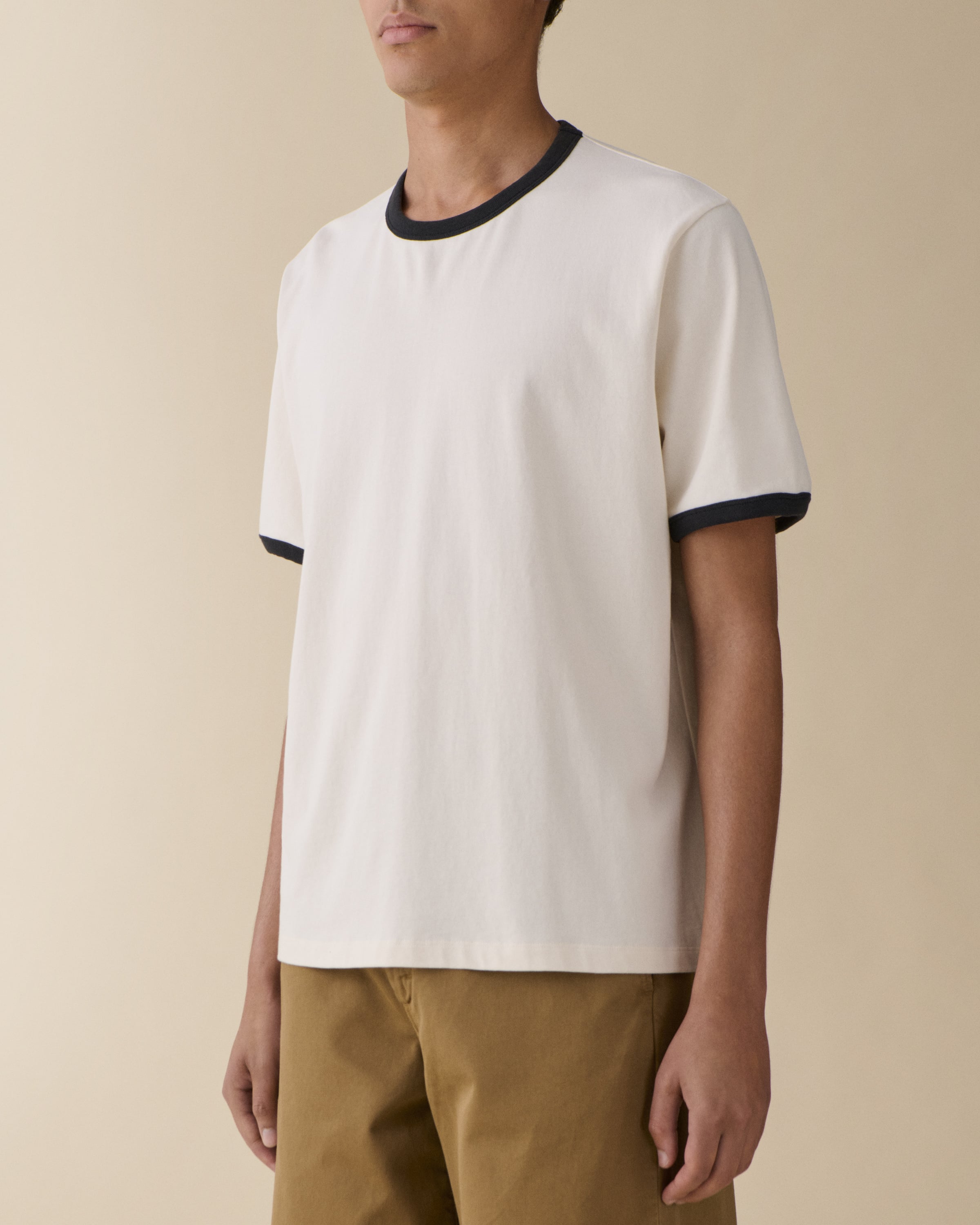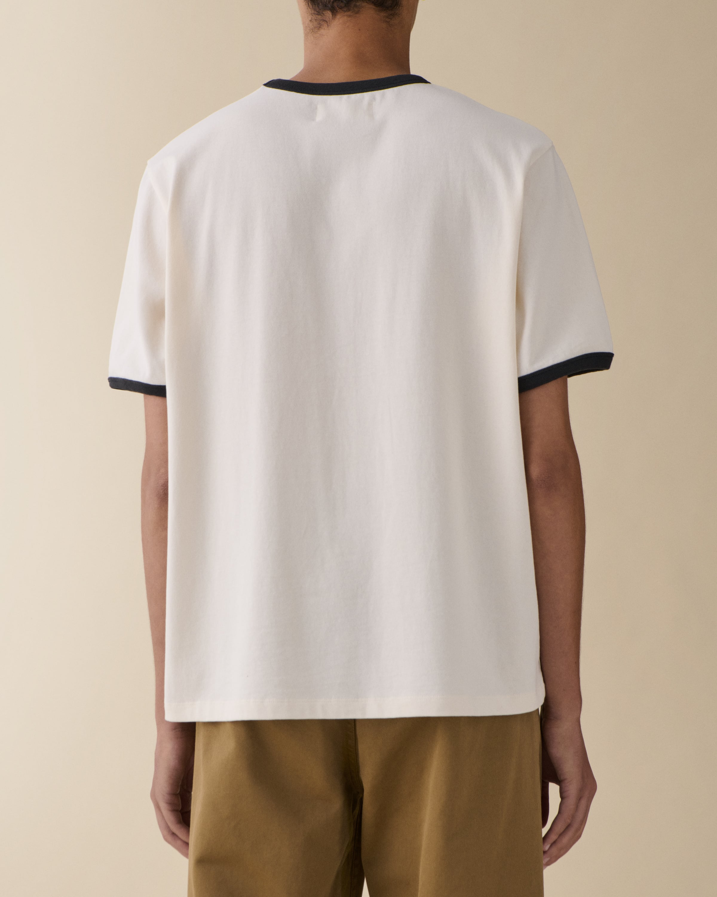 'Ringer' is a classic crew neck t-shirt featuring distinctive contrast trim detailing at the neckline and sleeves.