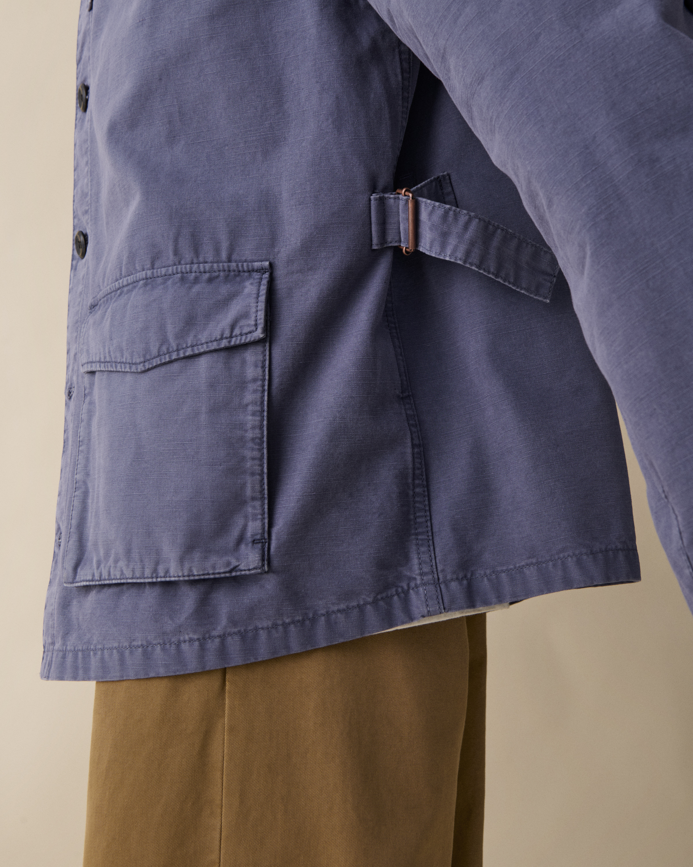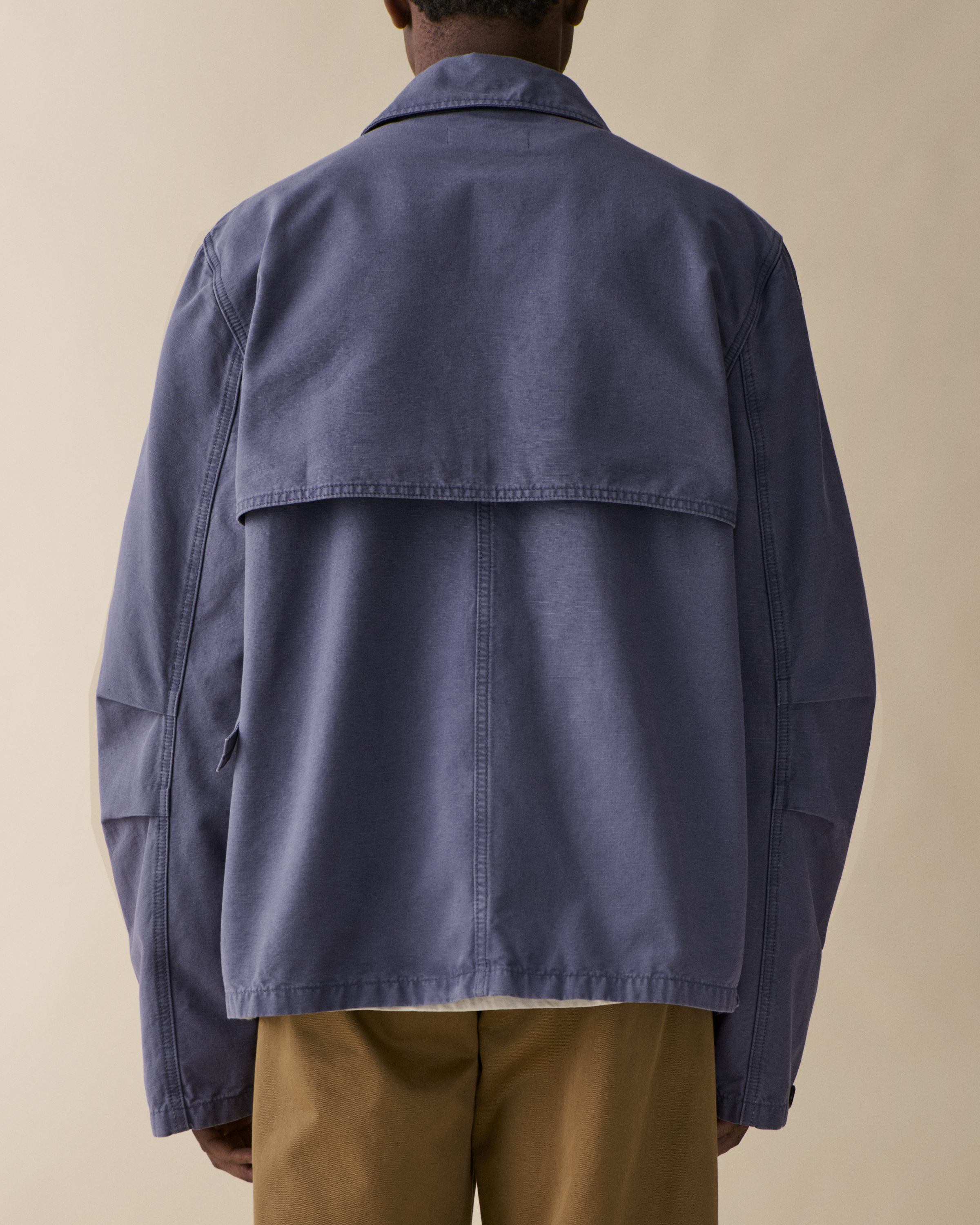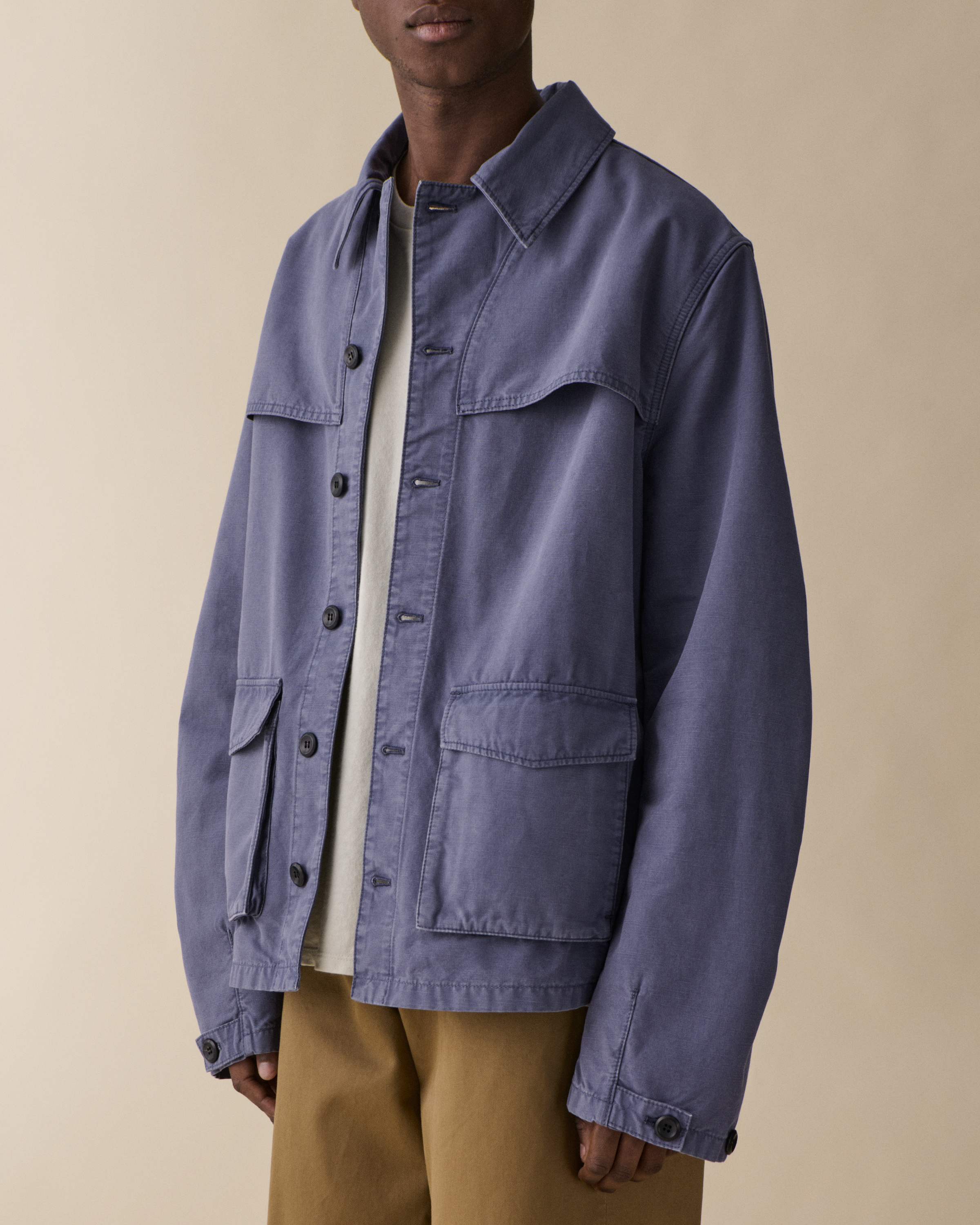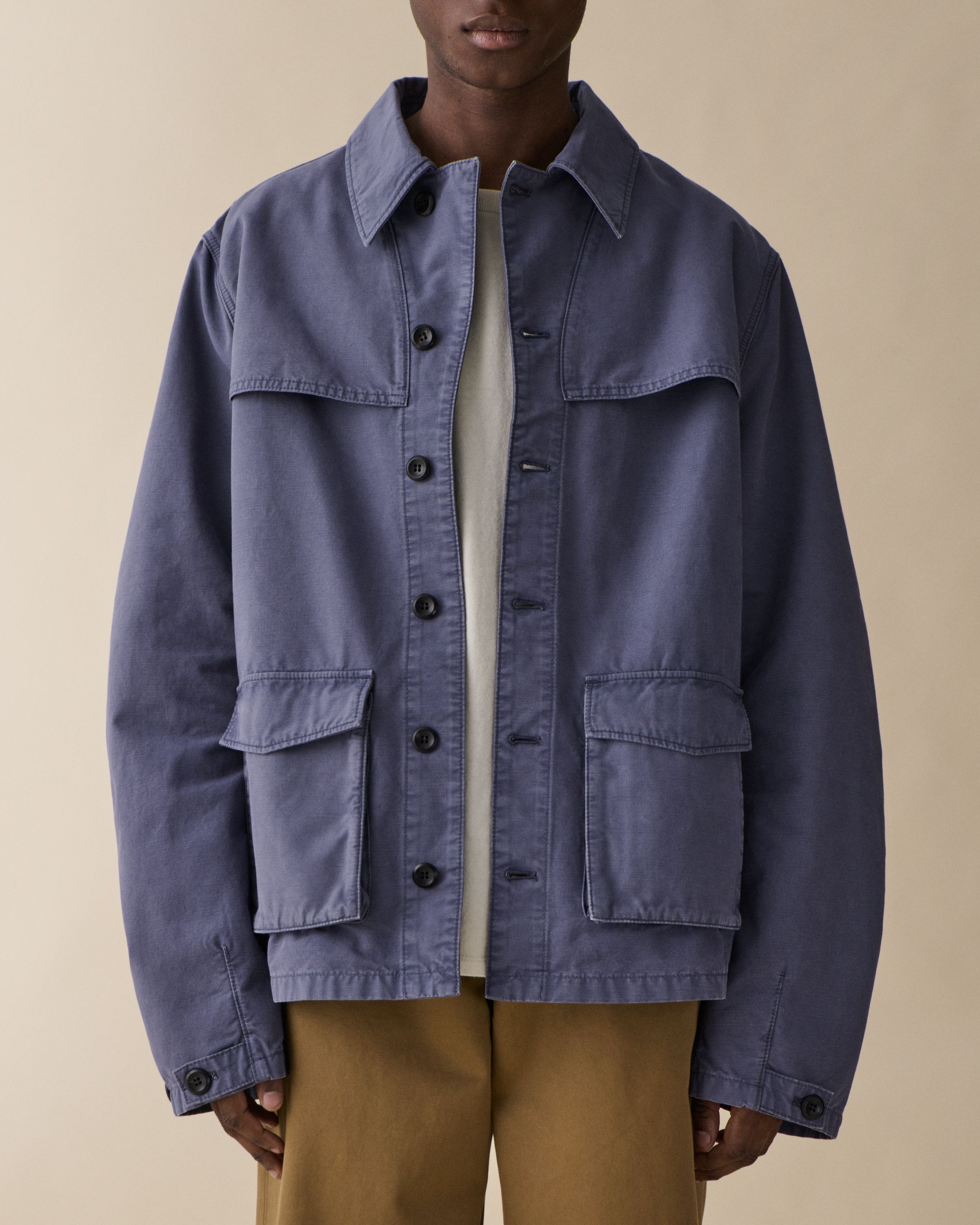 Wilde is a workwear-inspired shirt with a relaxed fit silhouette and button placket closure. Crafted in 100% cotton in a vivid Klein Blue, the garment features practical patch pockets, double layer reinforcement at chest, and elegant pleated sleeve details.