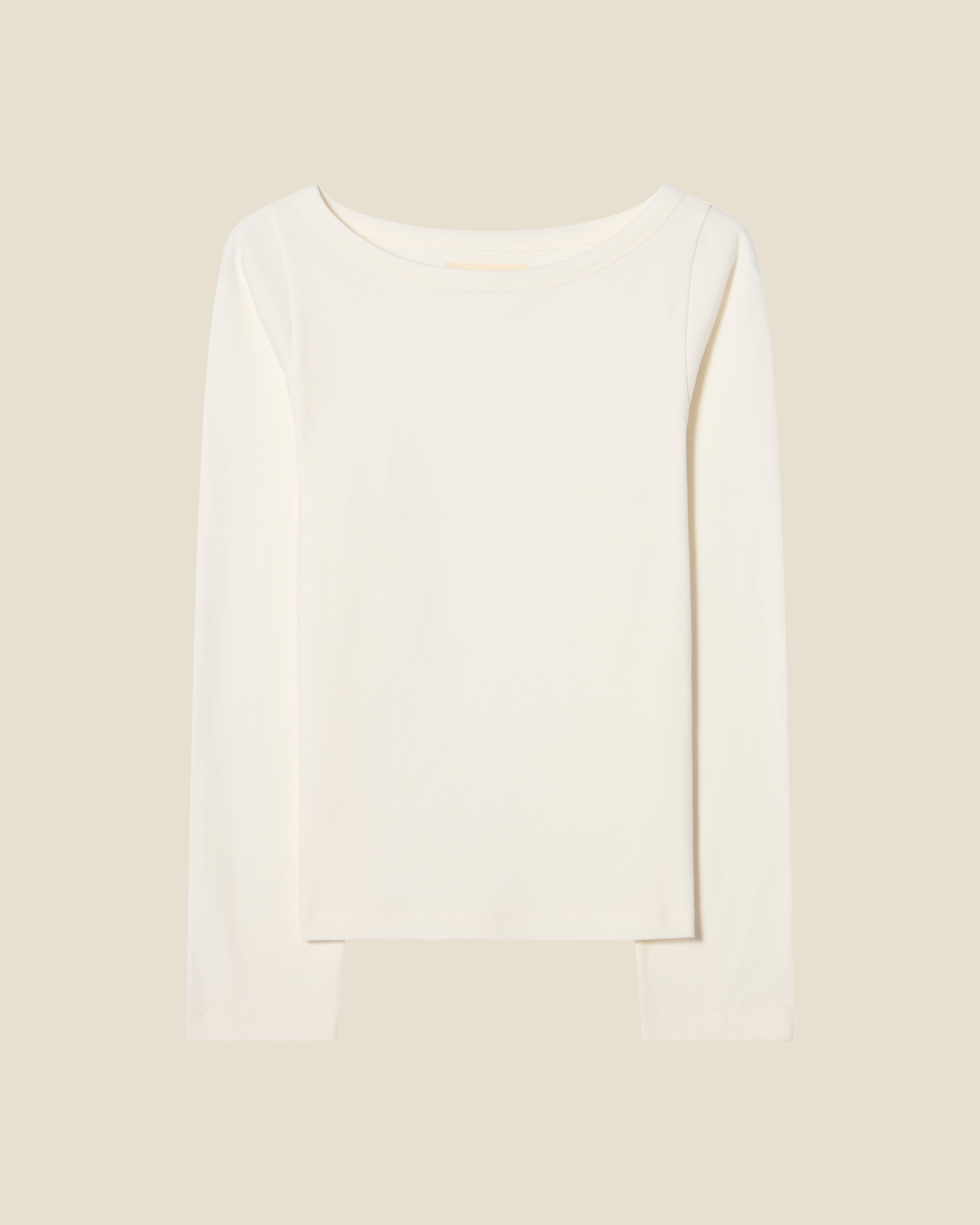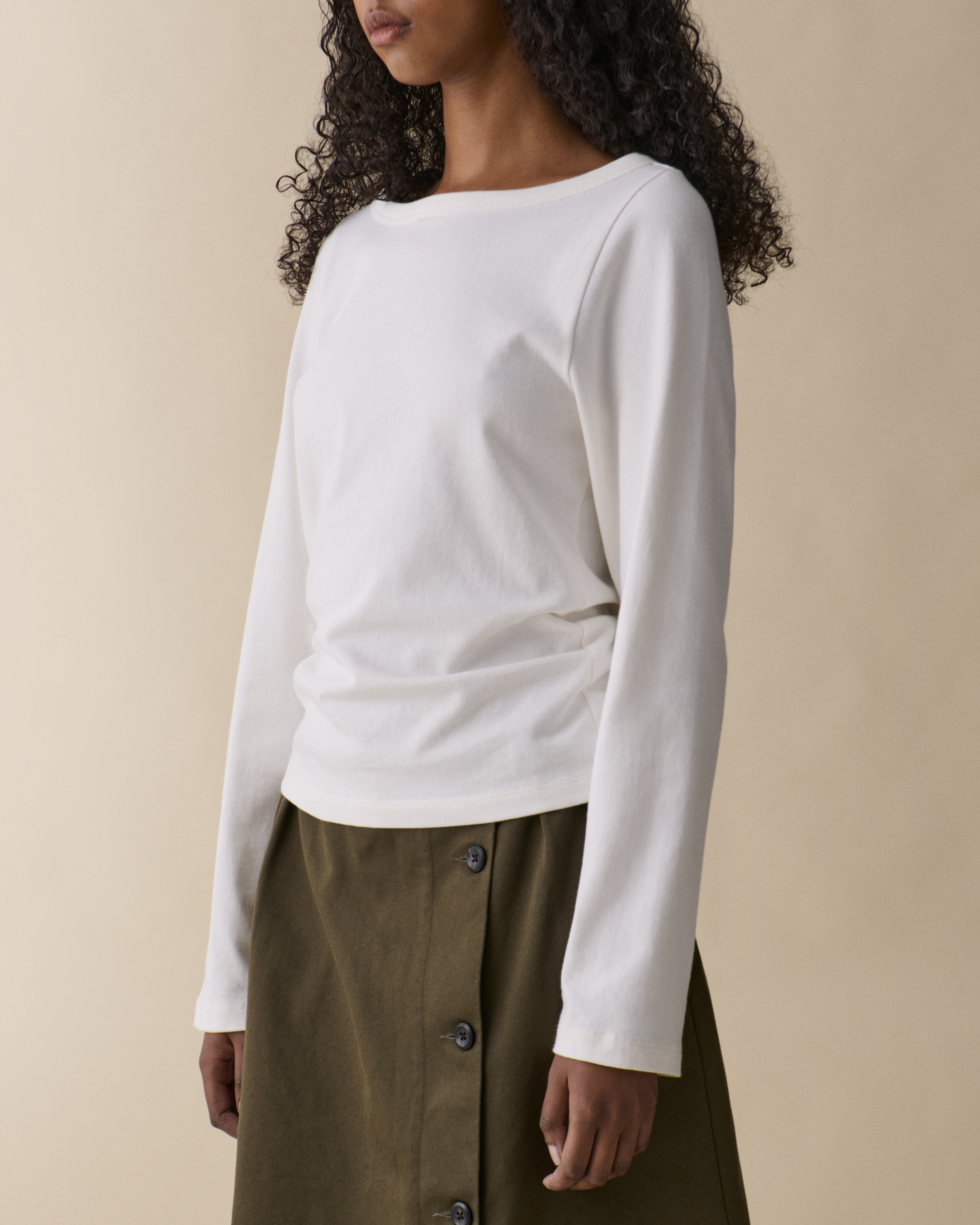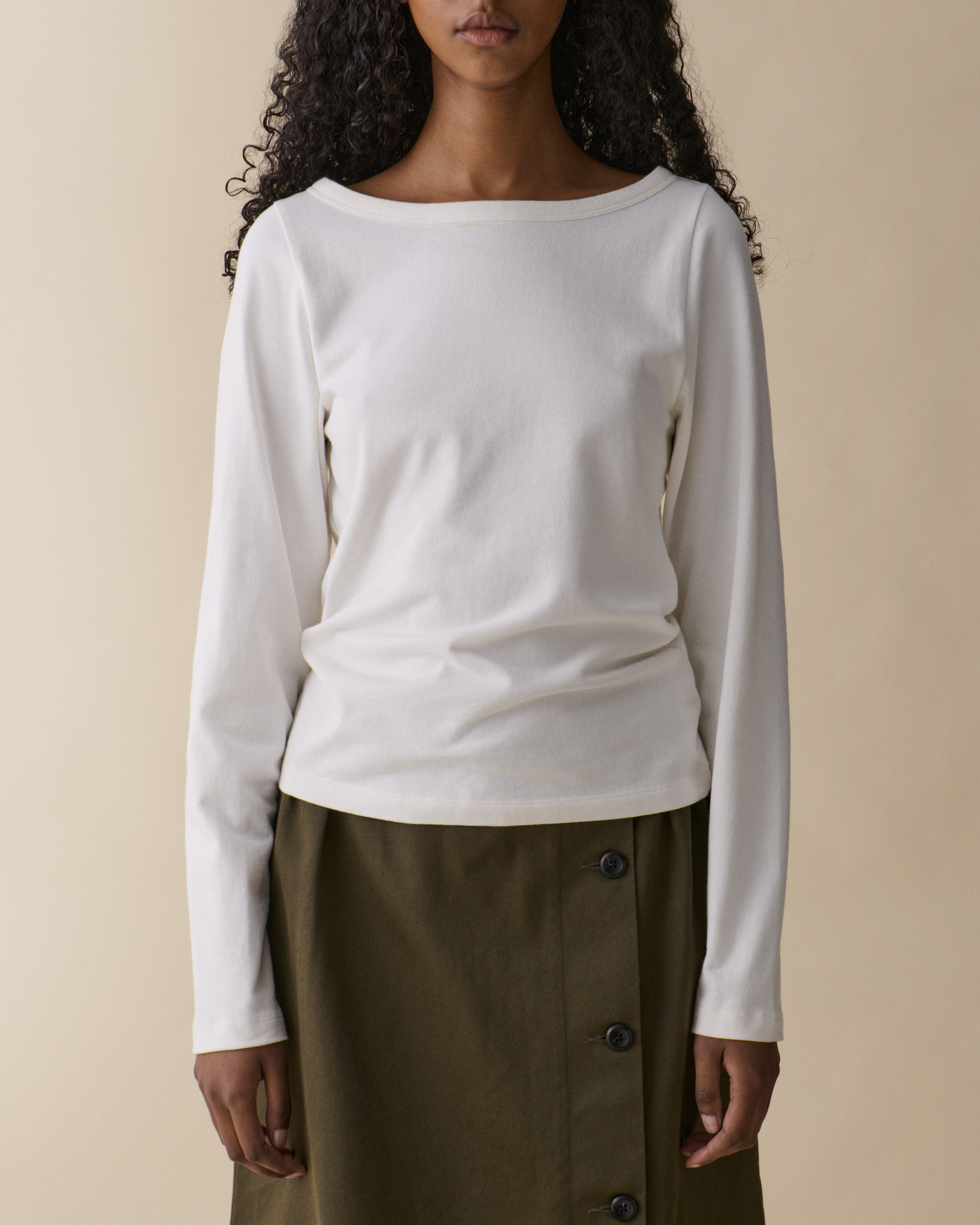 'Belle' is an elegant long sleeve tee featuring a refined boat neck and slim silhouette. Crafted in heavyweight 230 gsm cotton jersey that provides structure and durability while maintaining a luxurious feel against the skin. The natural white colorway offers versatile sophistication for both casual and dressed-up occasions.The premium cotton construction ensures this piece maintains its shape with wear, while the substantial weight gives it a more elevated presence than typical t-shirts. The boat neckline frames the collarbone beautifully, creating a feminine yet minimalist aesthetic.True to size. The slim fit is designed to follow the natural contours of the body without being restrictive.