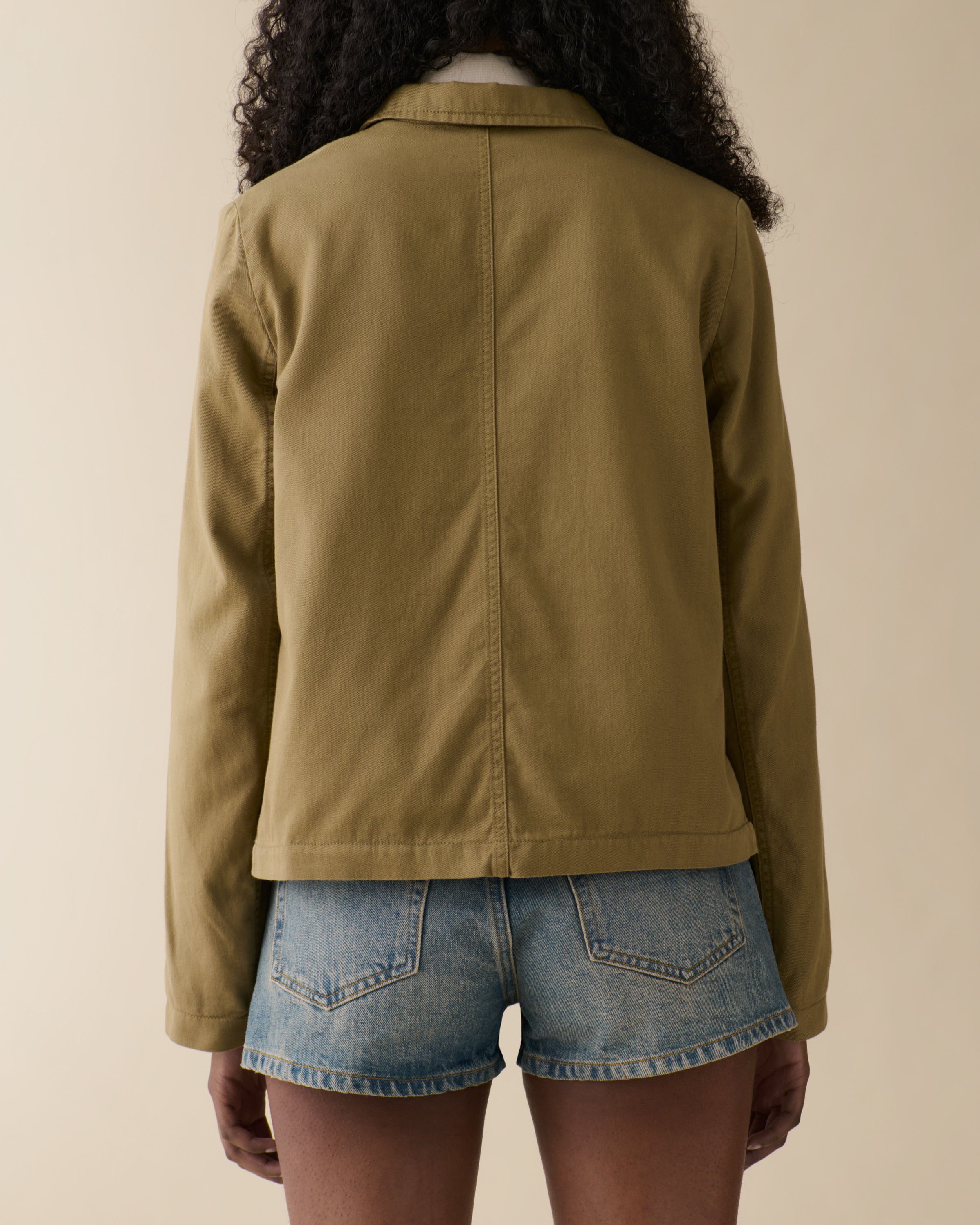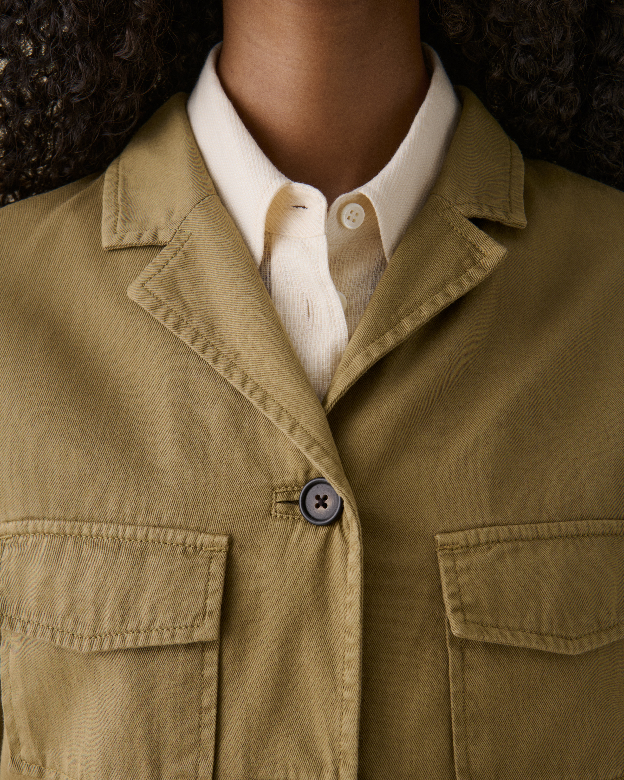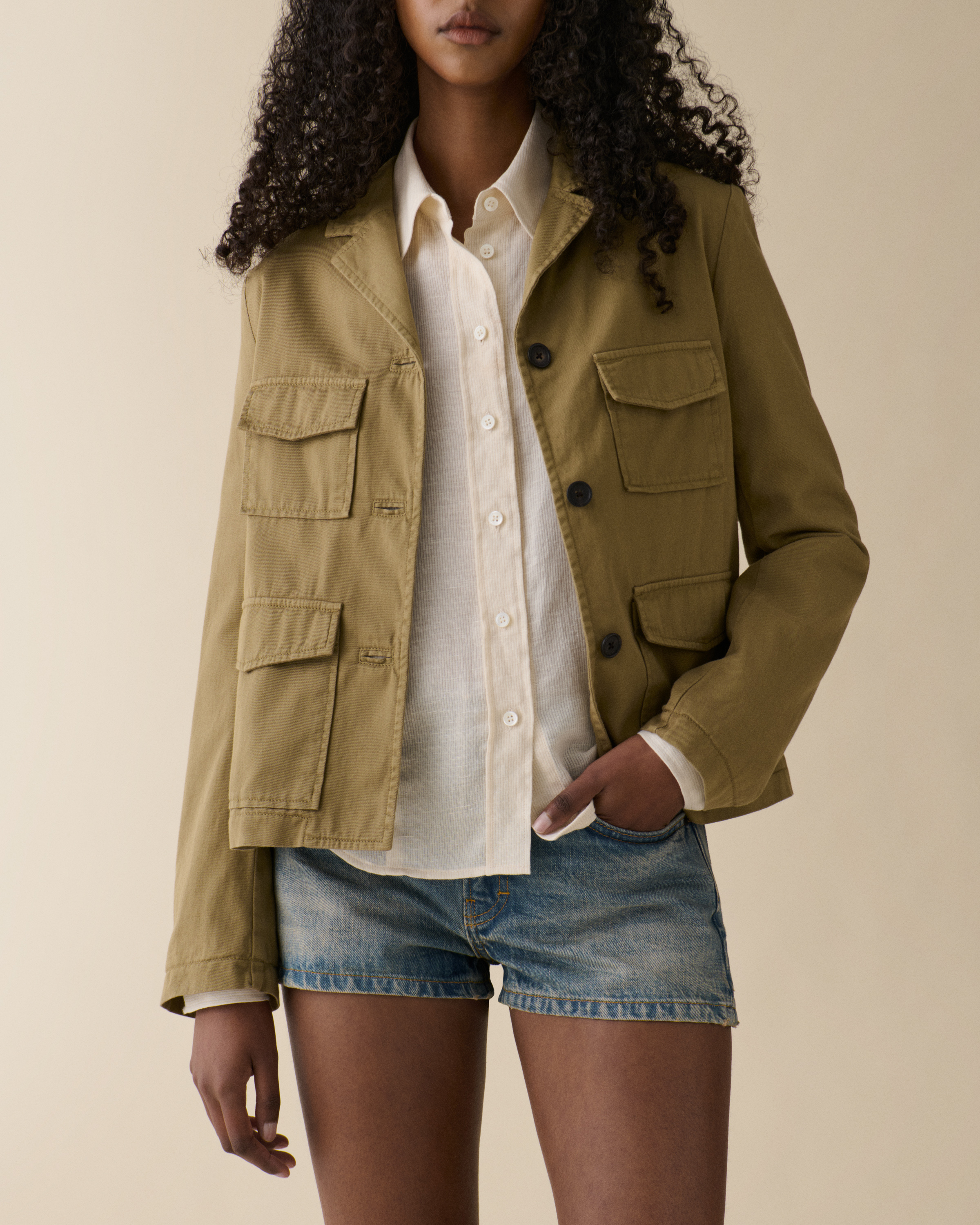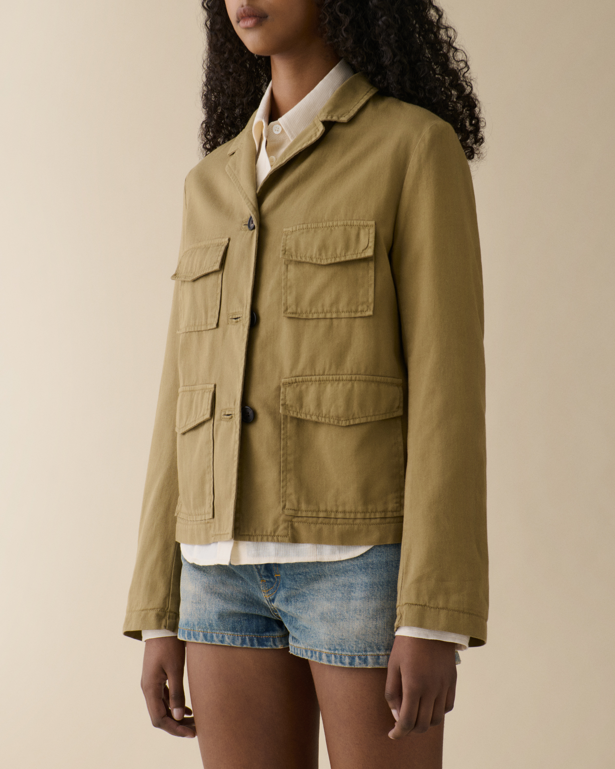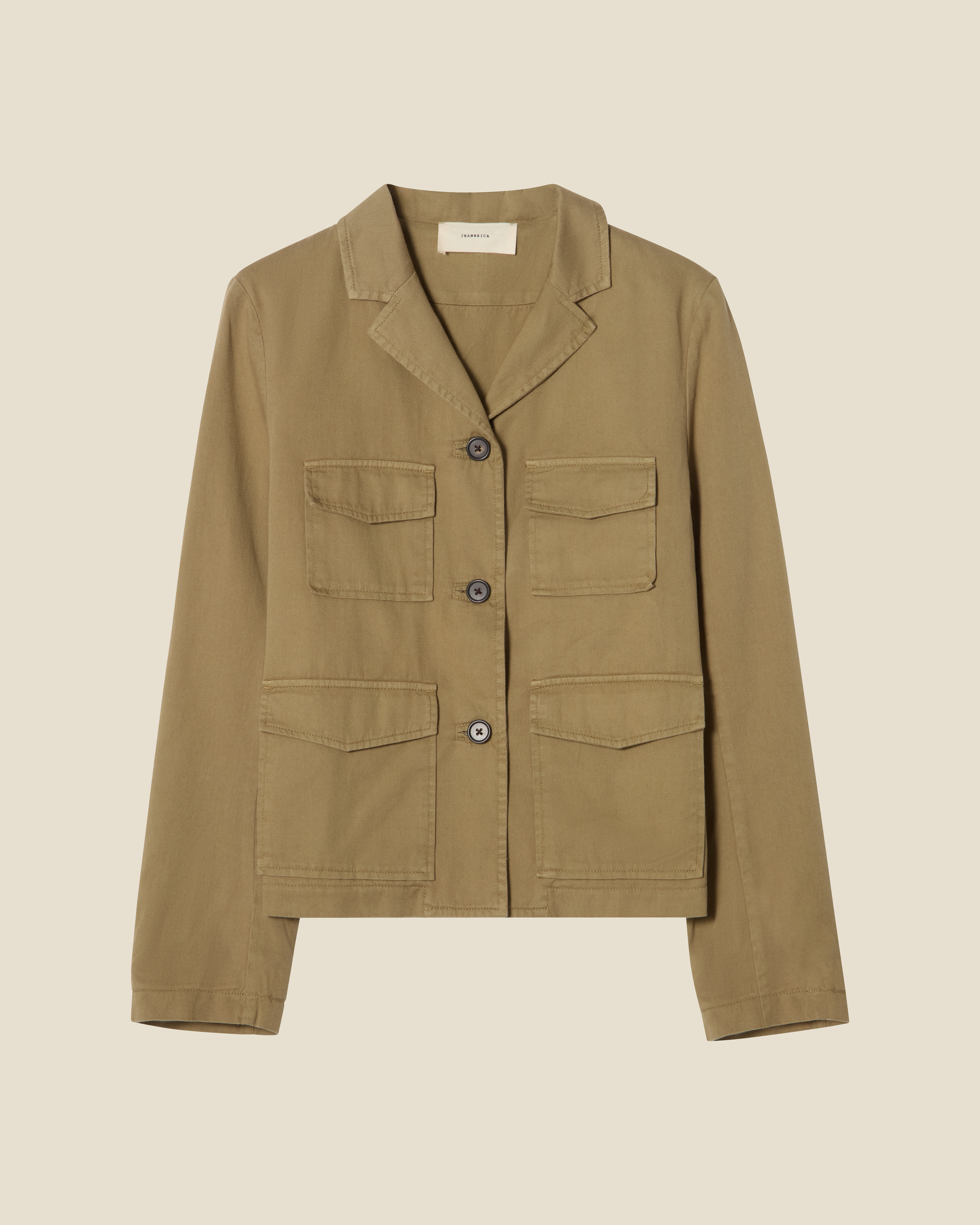 The 'Carole' jacket in beige is crafted from 100% cotton with a tight, elegant silhouette. It features four front patch pockets, jetted buttonholes, and a distinctive back seam detail. Fully lined with shell fabric for refined structure and a sophisticated non-stretch finish.