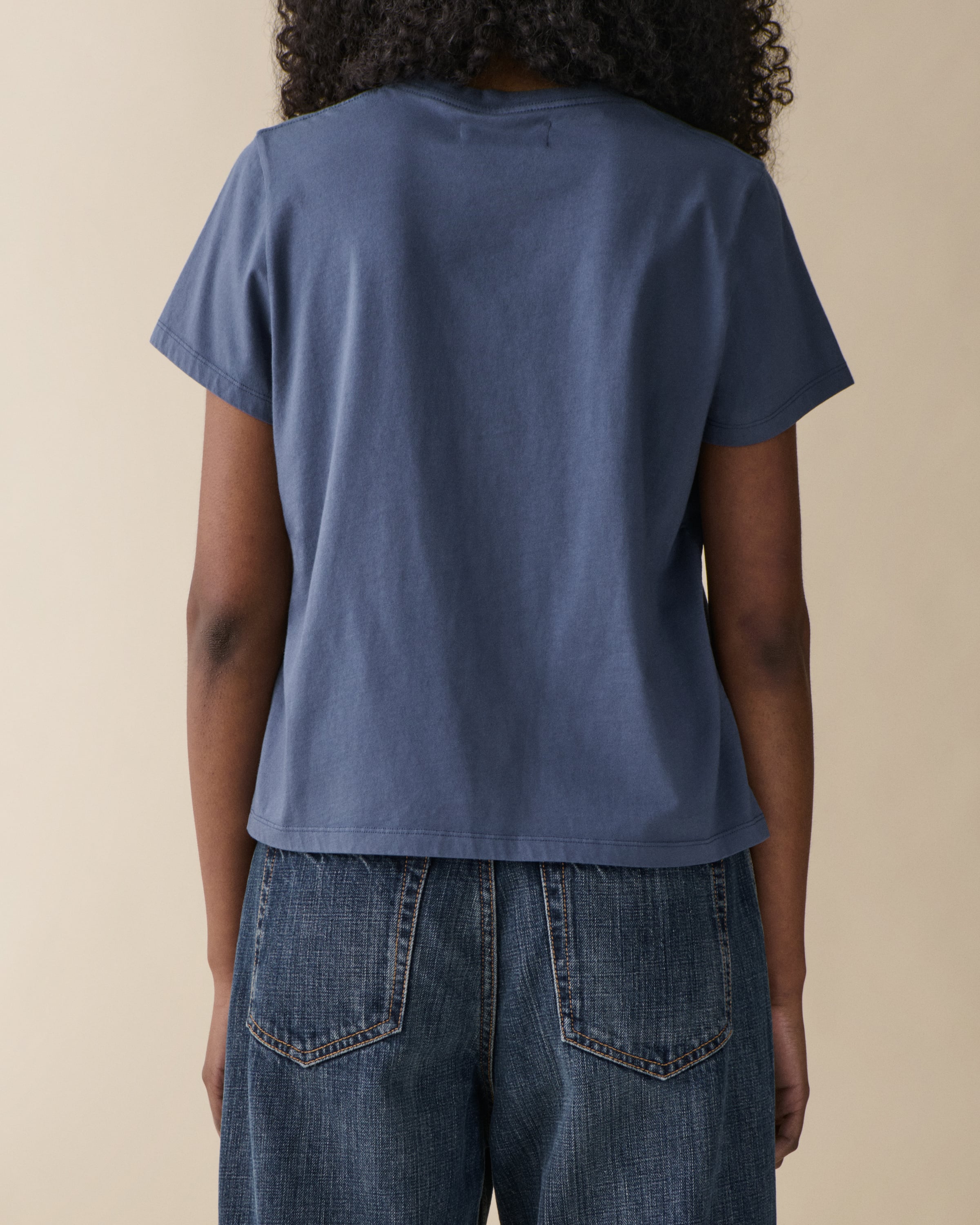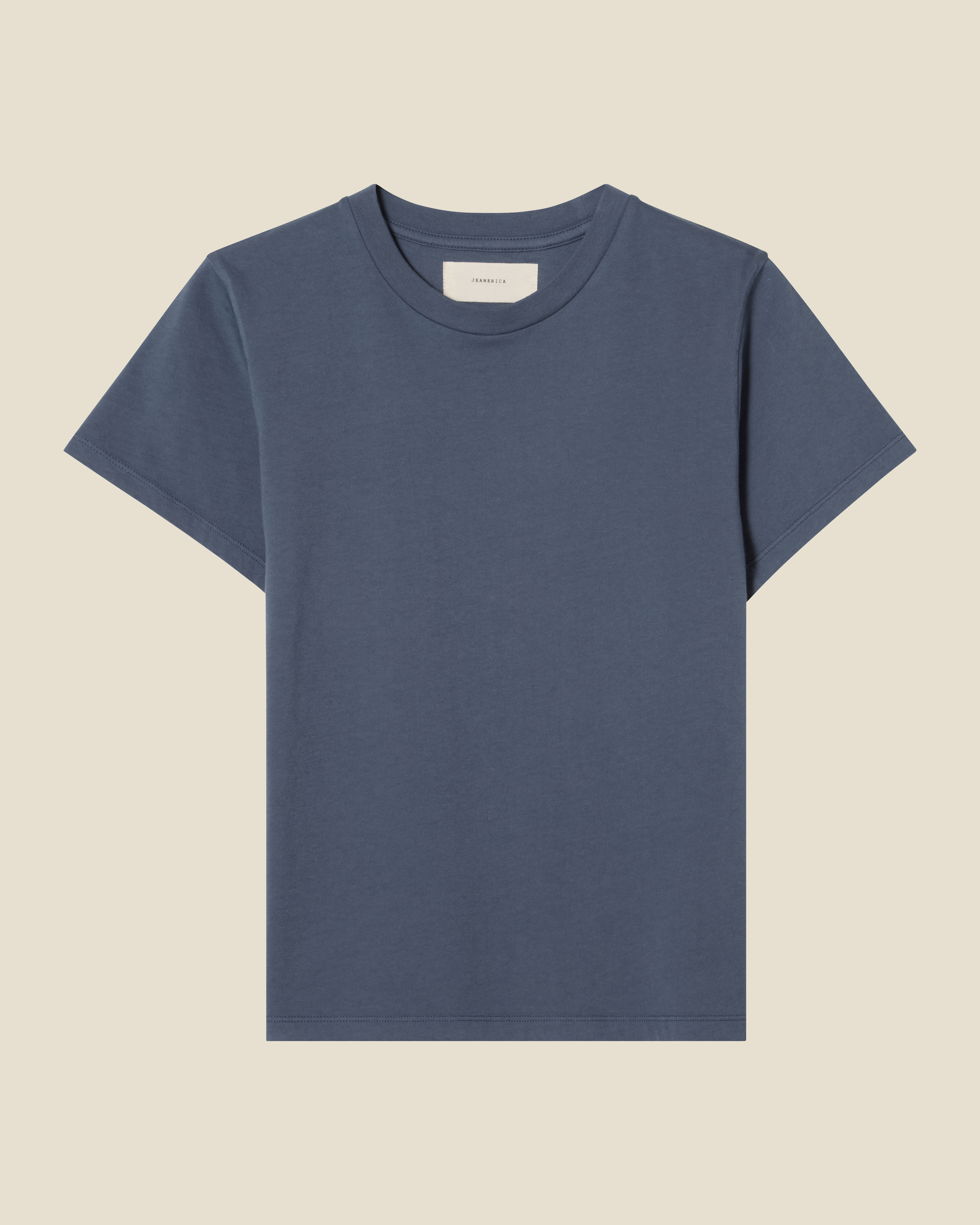 'Ines' is a small, boxy fit t-shirt in blue, perfectly tailored over the shoulders with a slightly shorter length. Crafted from premium 150gsm jersey made of pima cotton, this essential piece offers a smooth and luxurious handfeel that elevates your everyday wardrobe with minimalist style and exceptional quality.