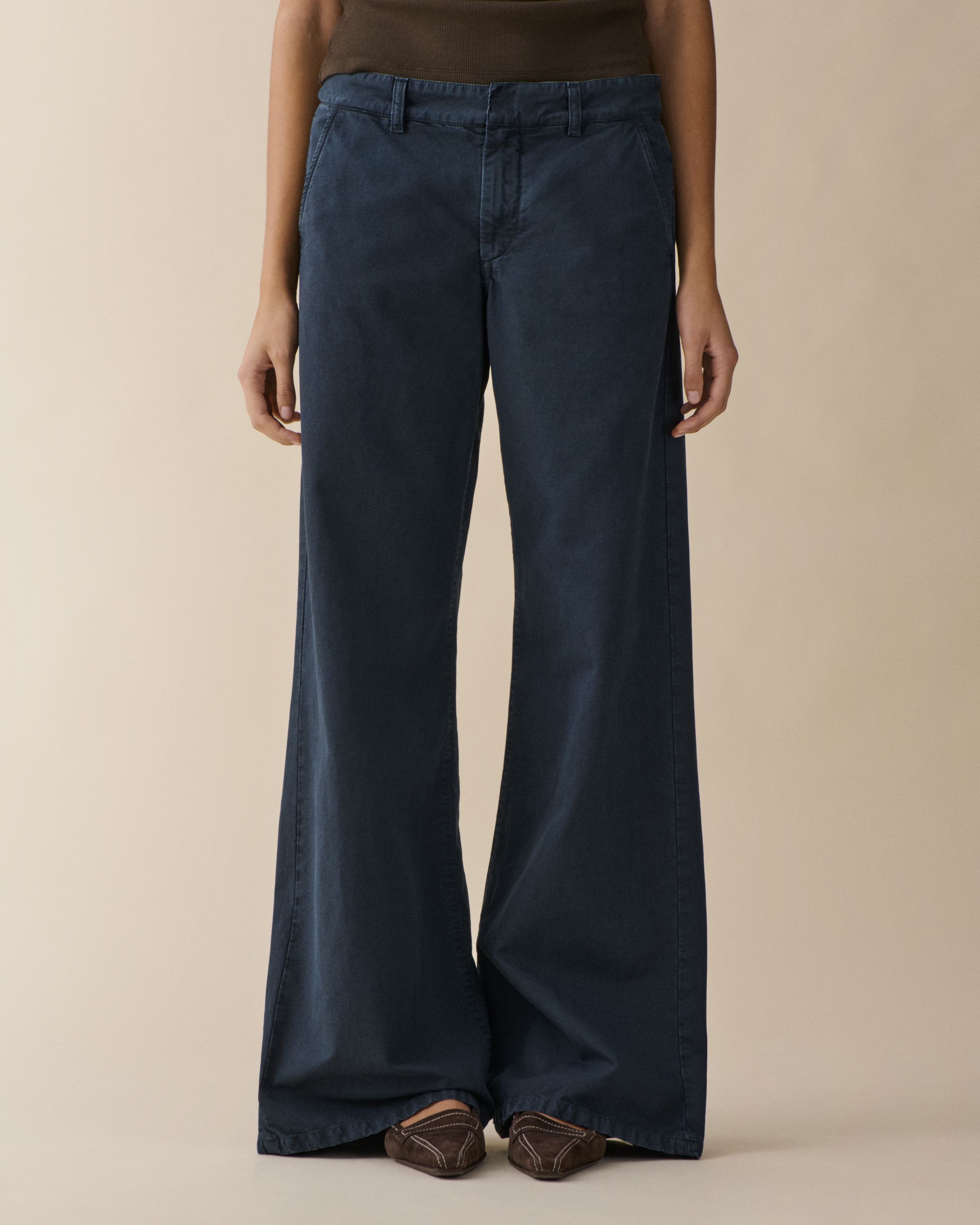 Kyoto Chino is an effortlessly cool low-waist trouser with a slouchy, loose flared silhouette that dramatically widens from thigh to hem. Crafted from 100% cotton in a sophisticated Pilé Peplum Grey, this non-stretch chino features a zip fly and relaxed fit through the hips. The contemporary interpretation of a classic silhouette combines casual comfort with distinctive style for versatile everyday wear.