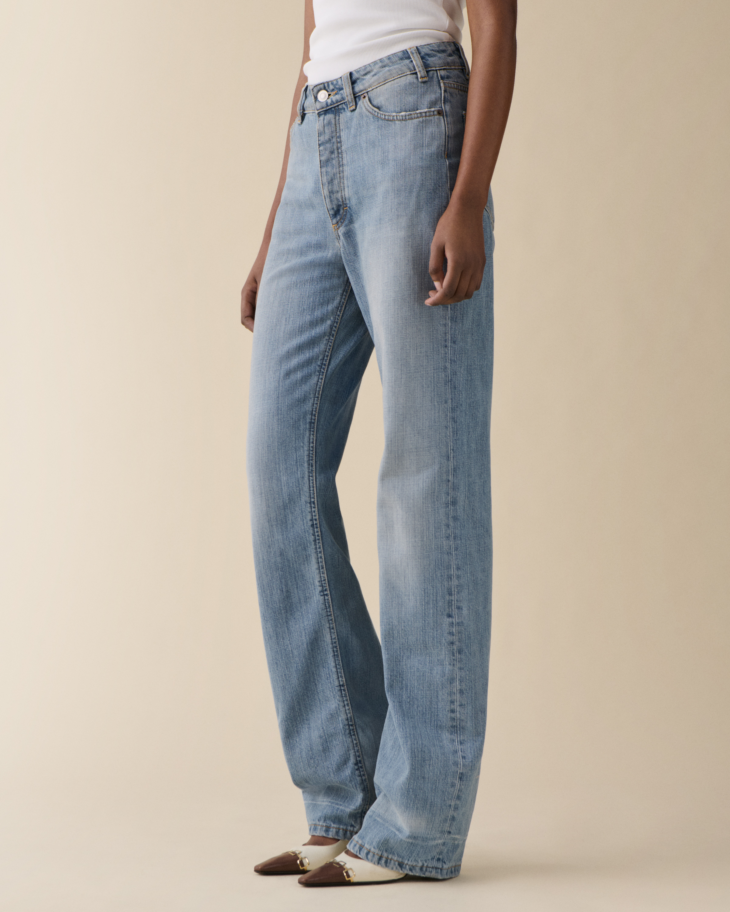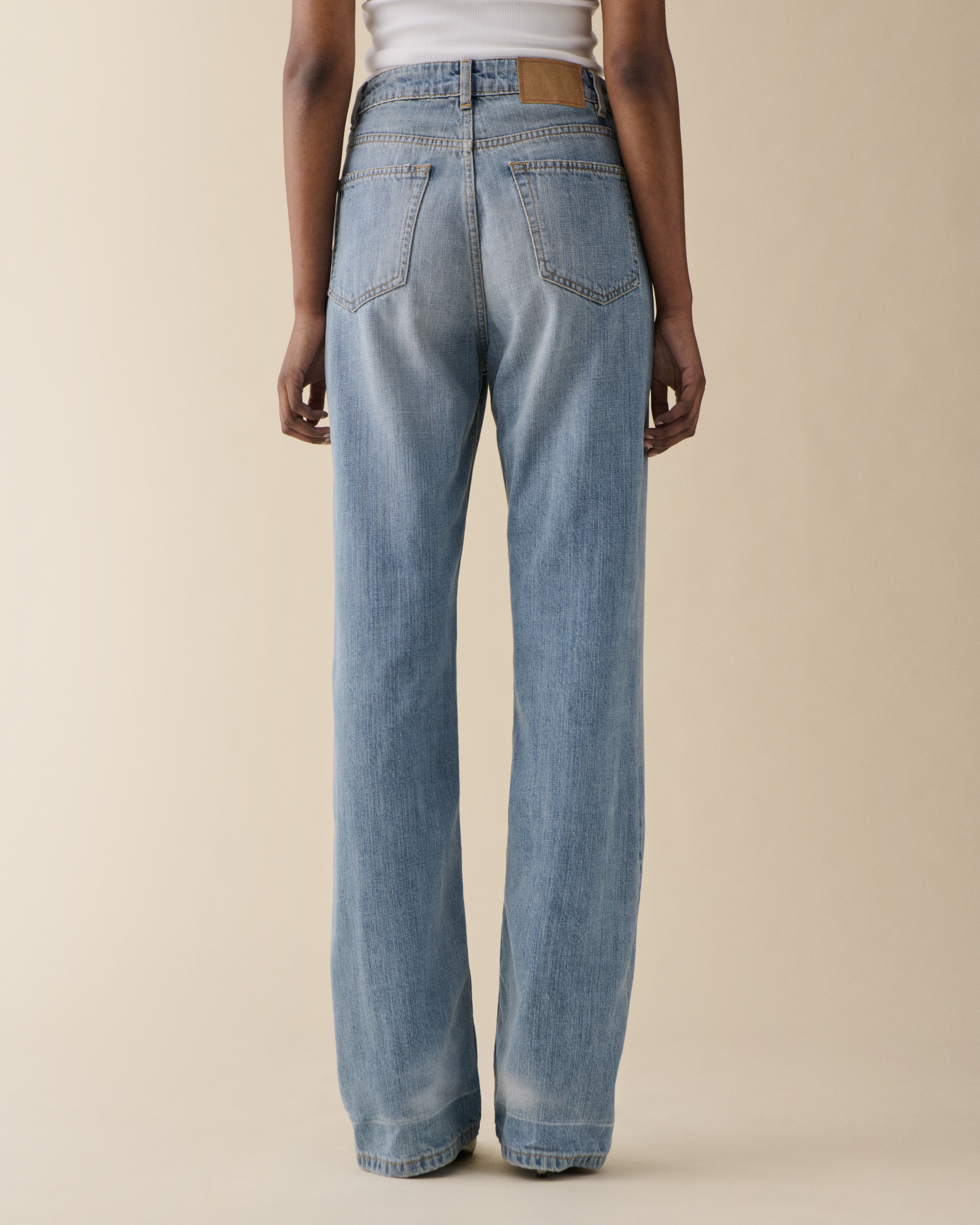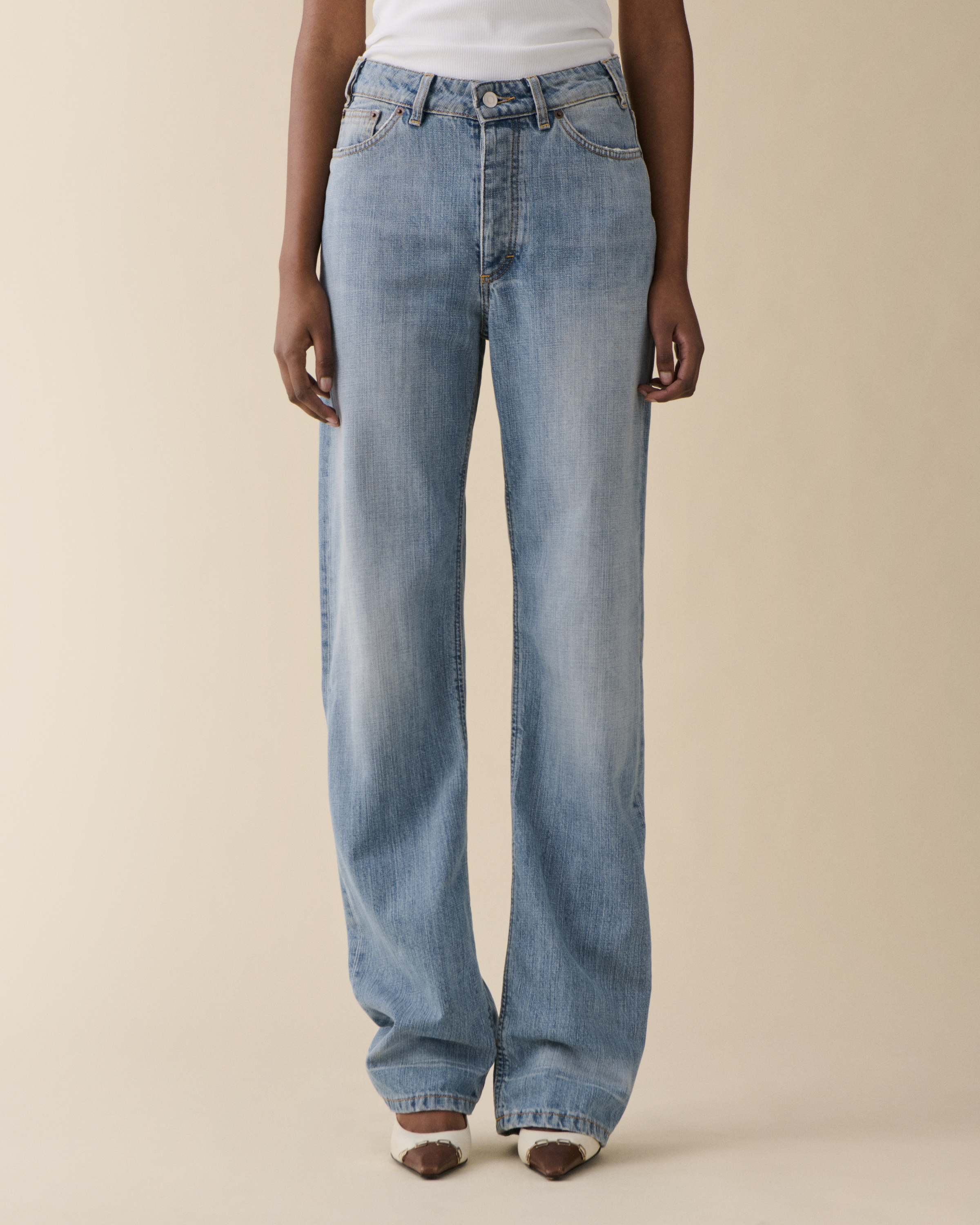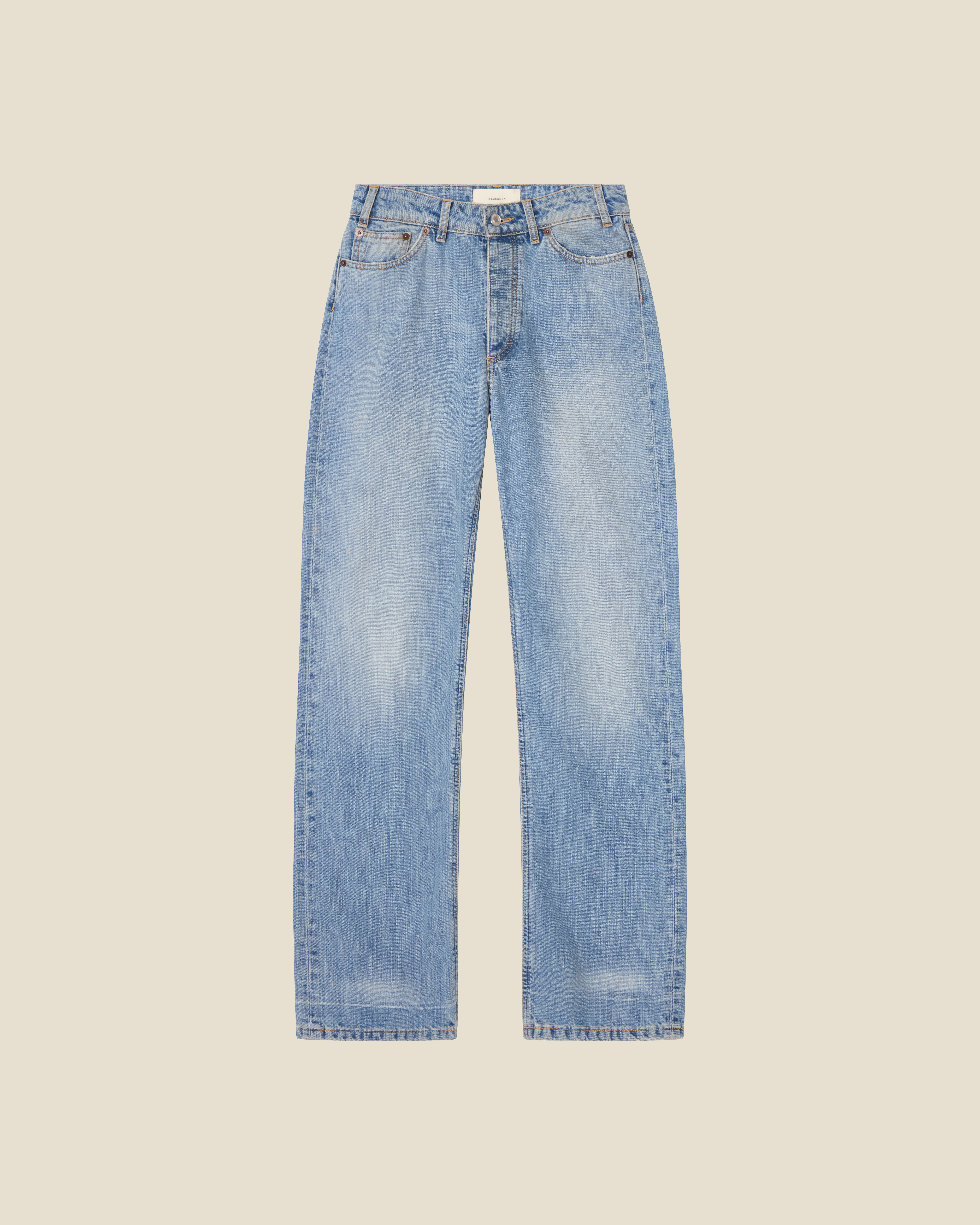 'Virgo' is a mid-waist denim with a straight leg silhouette. Featuring a fitted top and slightly loose leg, this style offers a feminine interpretation of the men's Vega design, creating the perfect boyfriend fit. Completed with a button fly closure and classic 5-pocket styling, this jean is crafted in light blue rigid, non-stretch denim for an authentic look and feel.