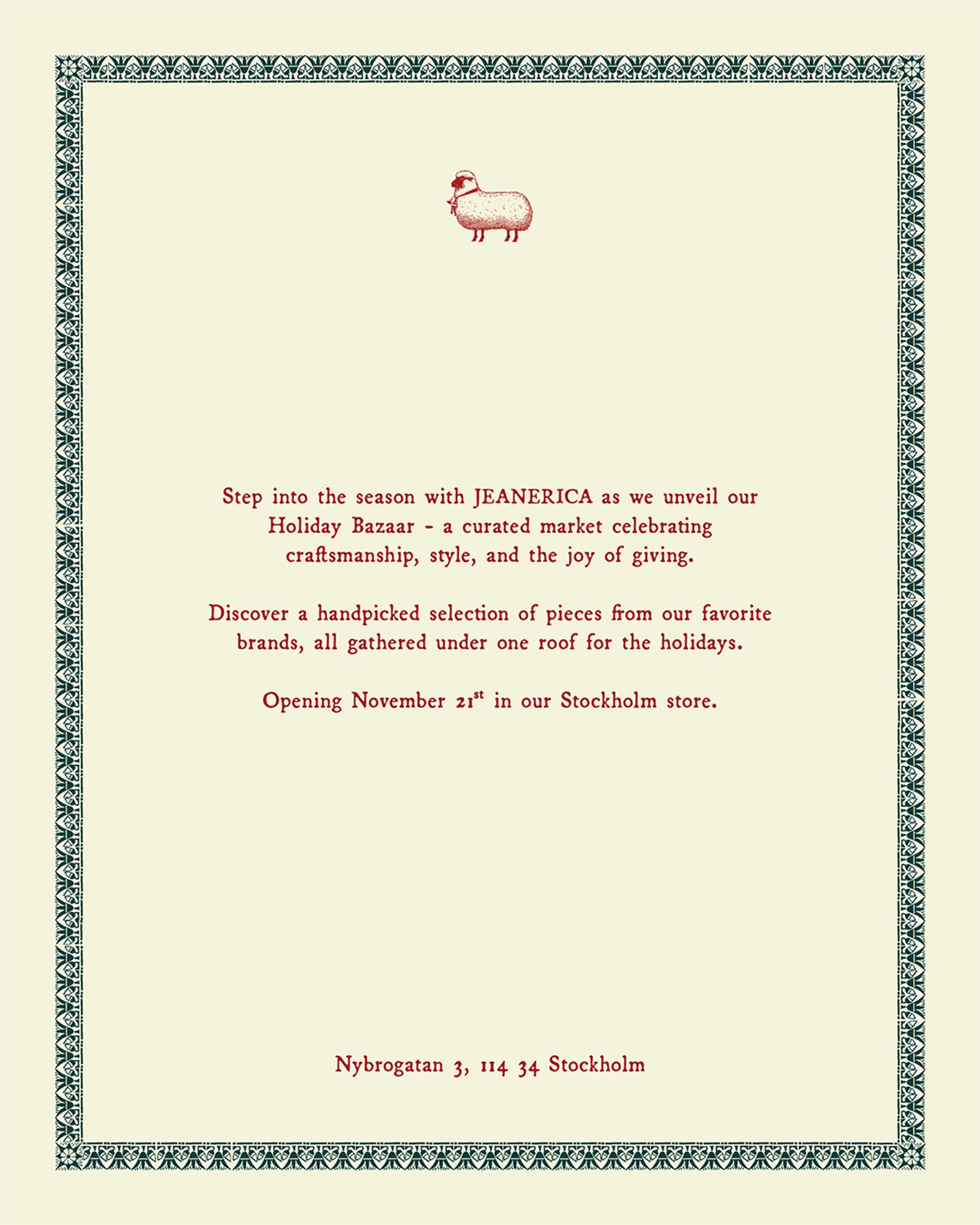 Step into the season with JEANERICA as we unveil our Holiday Bazaar - a curated market celebrating craftsmanship, style, and the joy of giving. Discover a handpicked selection of pieces from our favorite brands, all gathered under one roof for the holidays.