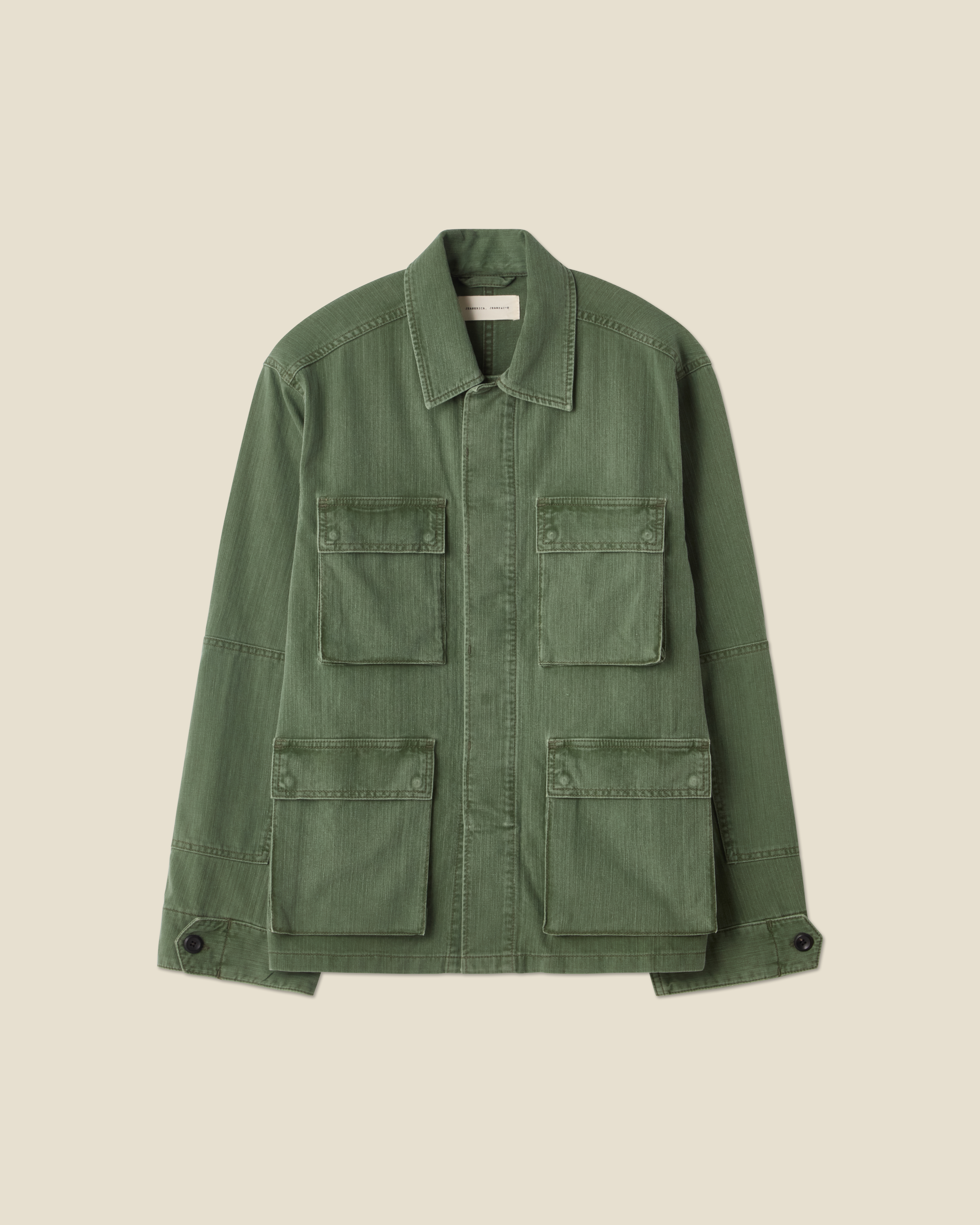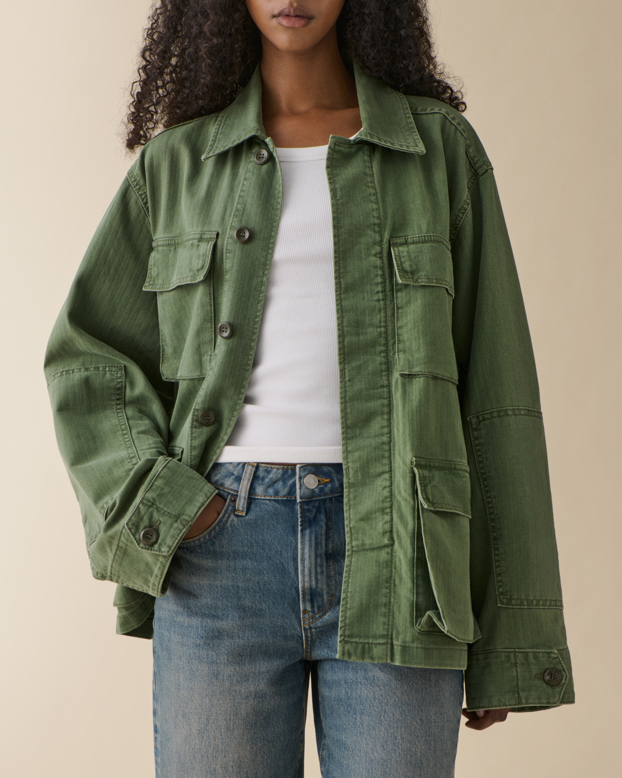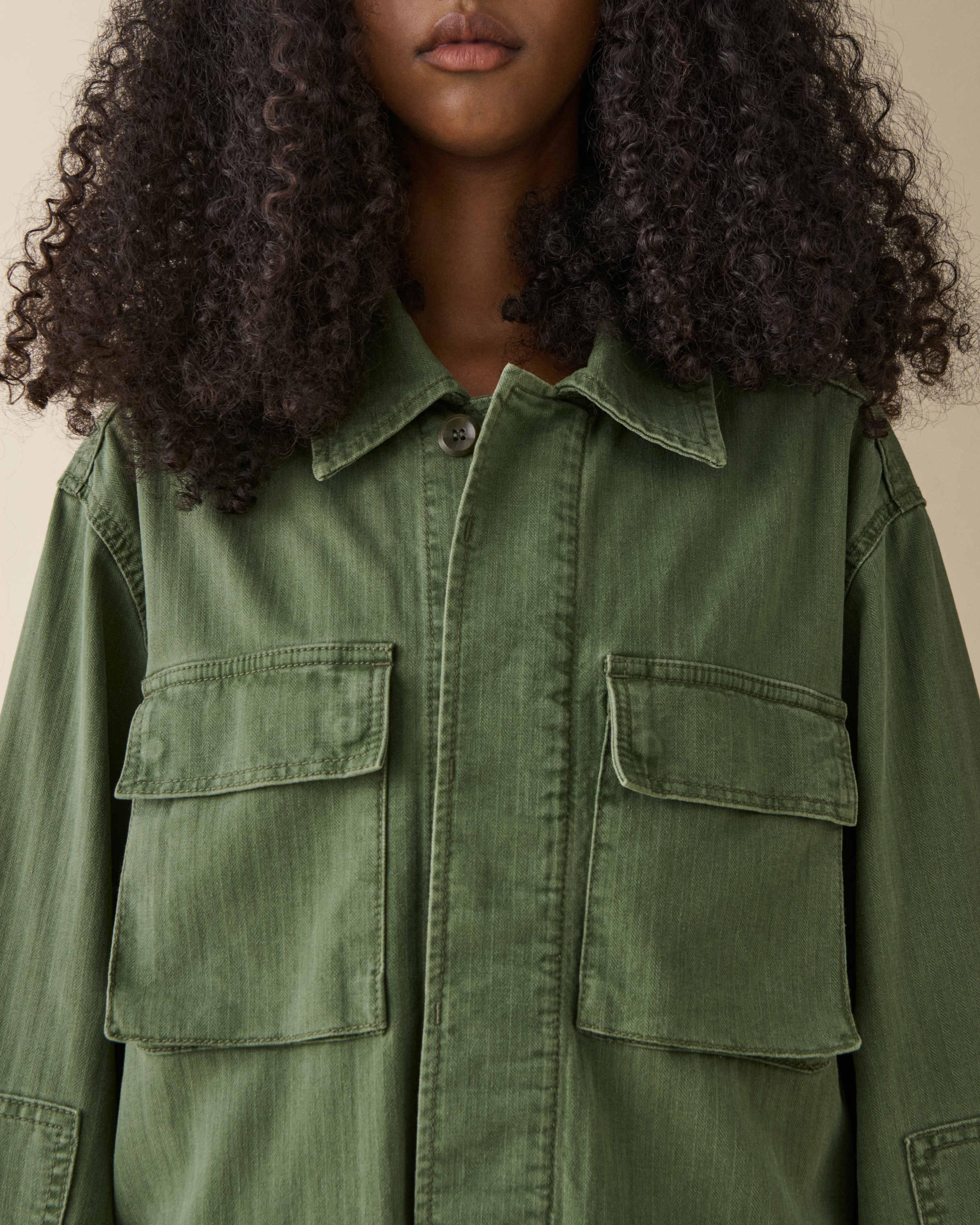 'Lucy' is a heritage-inspired army jacket with a slightly fitted silhouette. It features practical details including sleeve patches, hidden button closure, adjustable cuffs, and bulky patch pockets.Model is 175 cm/5'9” and wears size Small